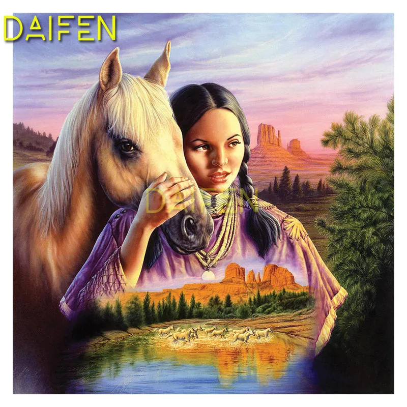 Алмазная 5D картина с полными кругами, вышивка крестиком сделай сам, полная выкладка, мозаика из страз с изображением индейской девушки, лошади, пустыни, озера