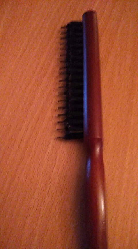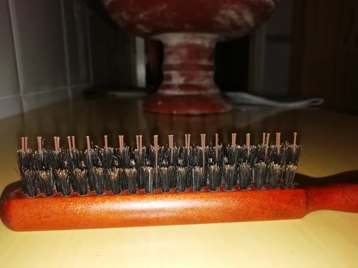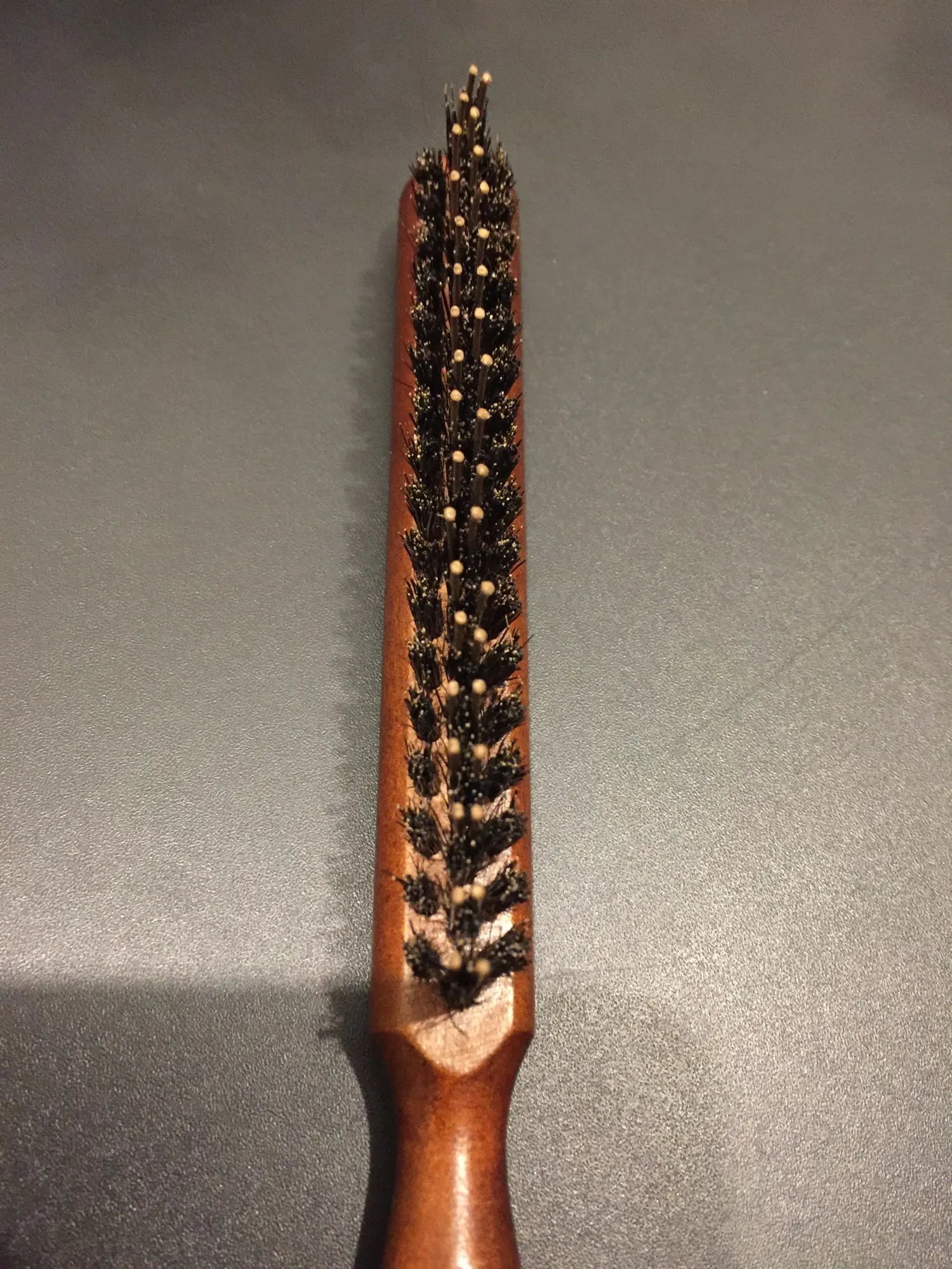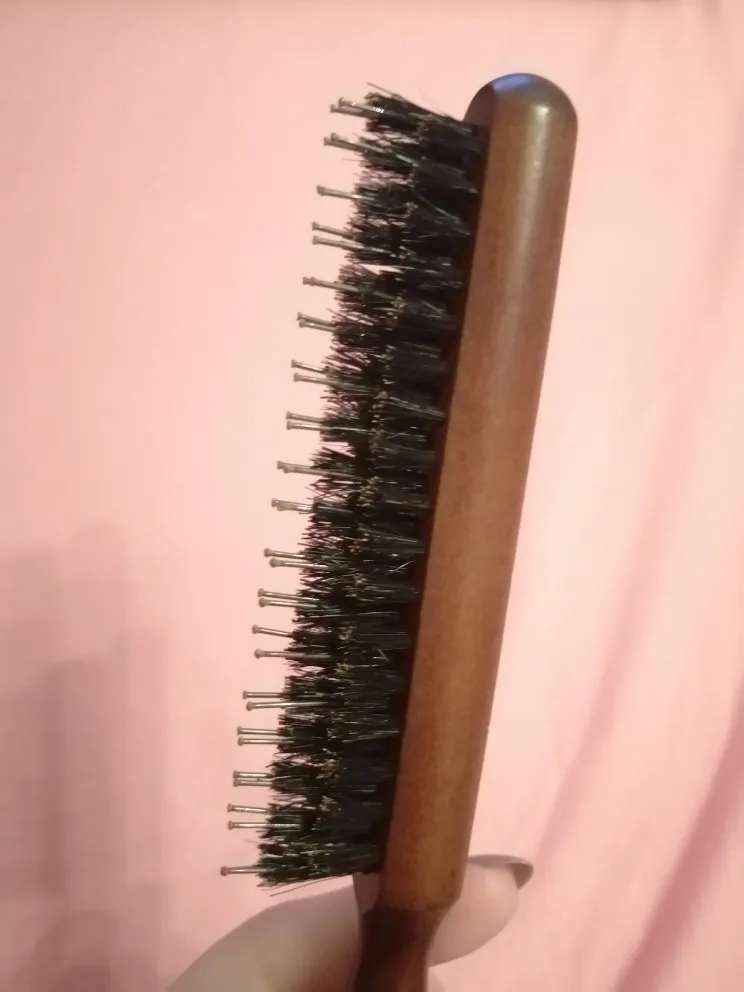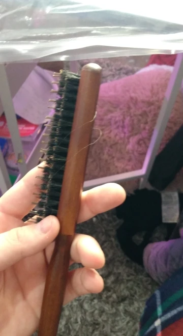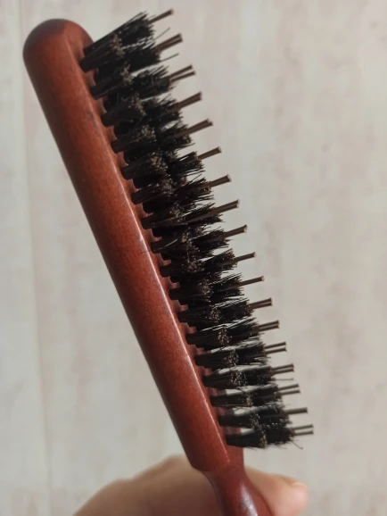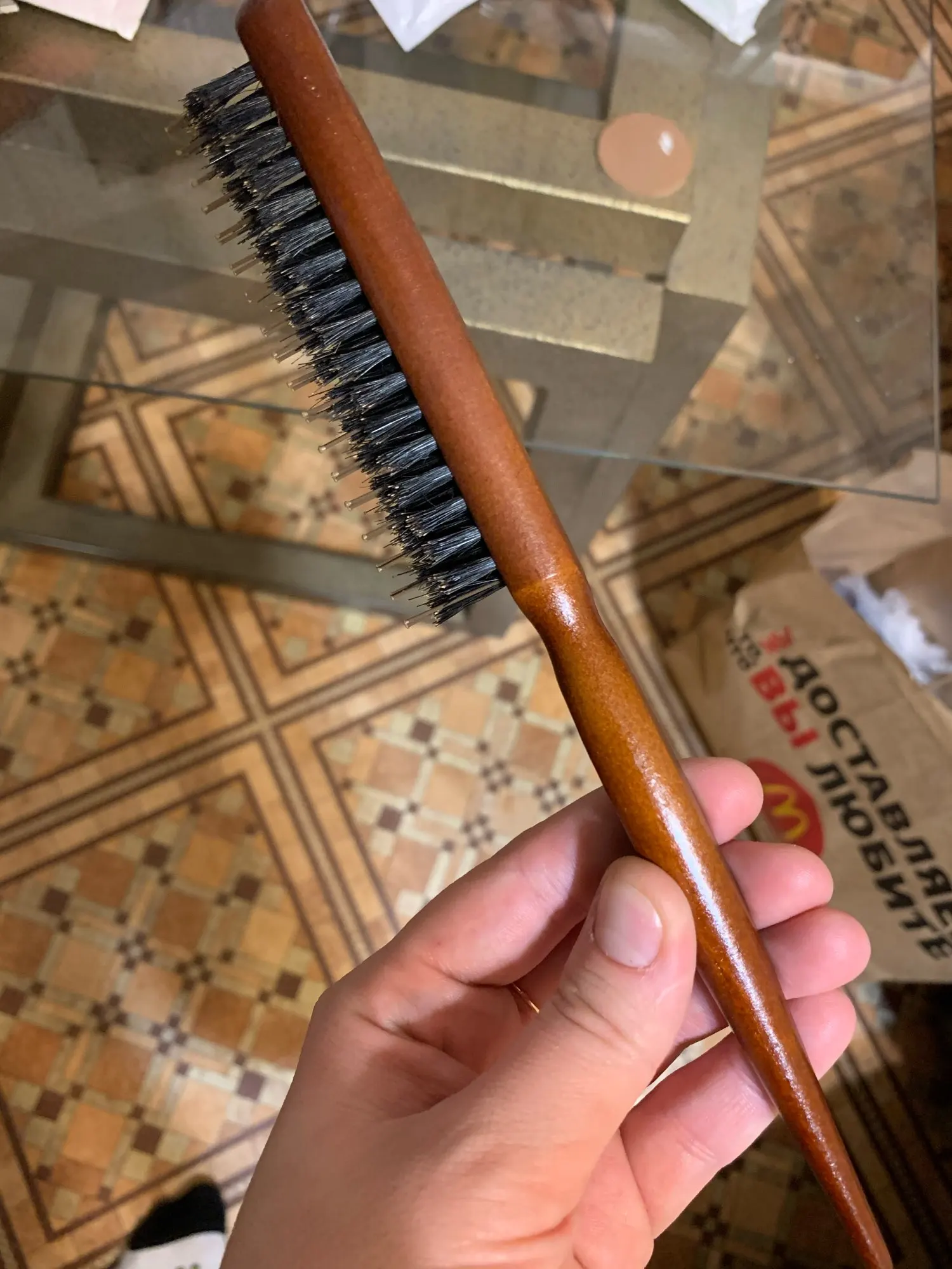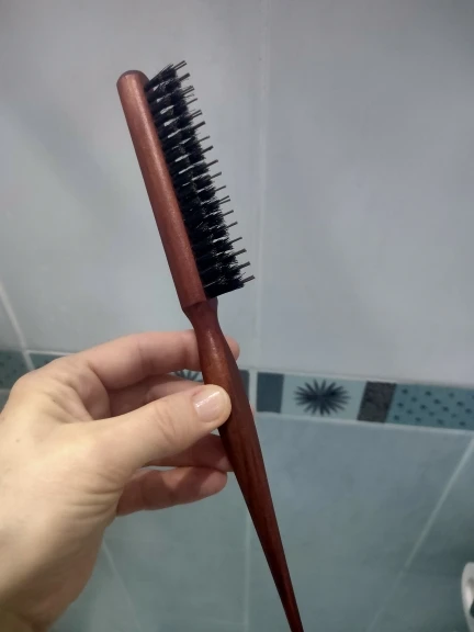 Отличная расчёска для начёса. Смесь натуральной щетины и более высоких пластиковых зубчиков-гвоздиков. Основание деревянное, покрыто лаком или воском, очень хорошо выполнено. Нет зазубрин и неровностей, все гладко и аккуратно. Ручка эргономичная. Очень довольна покупкой, рекомендую) большое спасибо продавцу!)