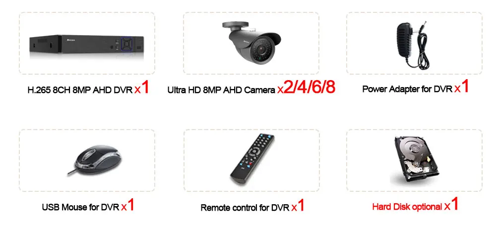 1 х 8-канальный H.265 AHD 4K DVR NVR HVR 6 в 1 цифровой видеорегистратор;2/4/6/8 x HD 8.0MP для дома и улицы ИК Ночного Видения Всепогодные камеры;1 х адаптер питания для DVR;1 X USB мышь для DVR;1 пульт дистанционного управления для DVR;1 X CD программное обеспечение для DVRЖесткий диск опционально!