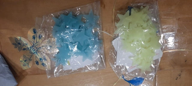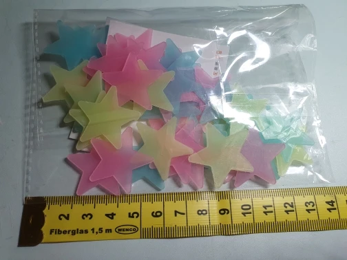 Мне изначально казалось что звезды силиконовые, мягкие (откуда я это взяла, не знаю) звезды пластиковые, дополнительно к ним двусторонний скотч. Можно разместить в интерьере, можно засыпать звезды в прозрачную вазу. Поглащают свет, святят хорошо. Без запаха постороннего, достаточно аккуратные, но местами есть зацепки пластиковые. Пришли относительно быстро, на фоне других посылок, которые заказаны раньше и не ещё не покинули границу.