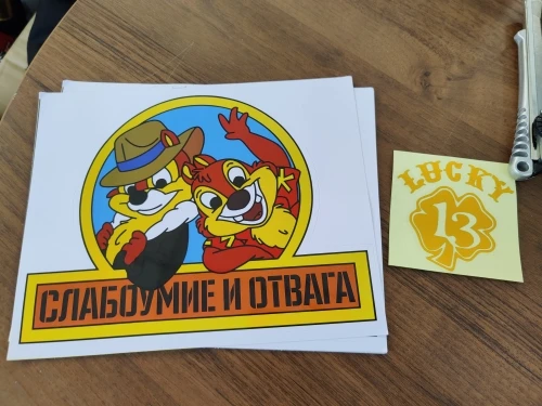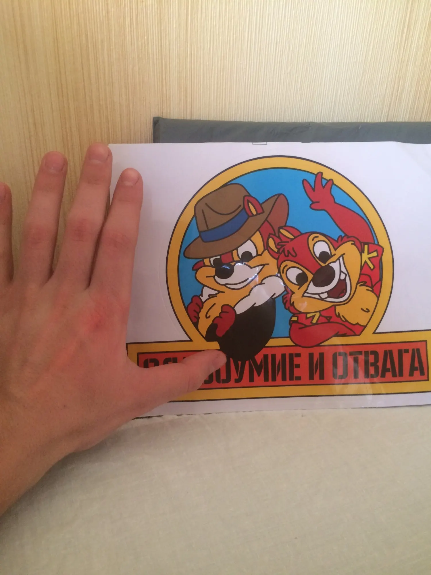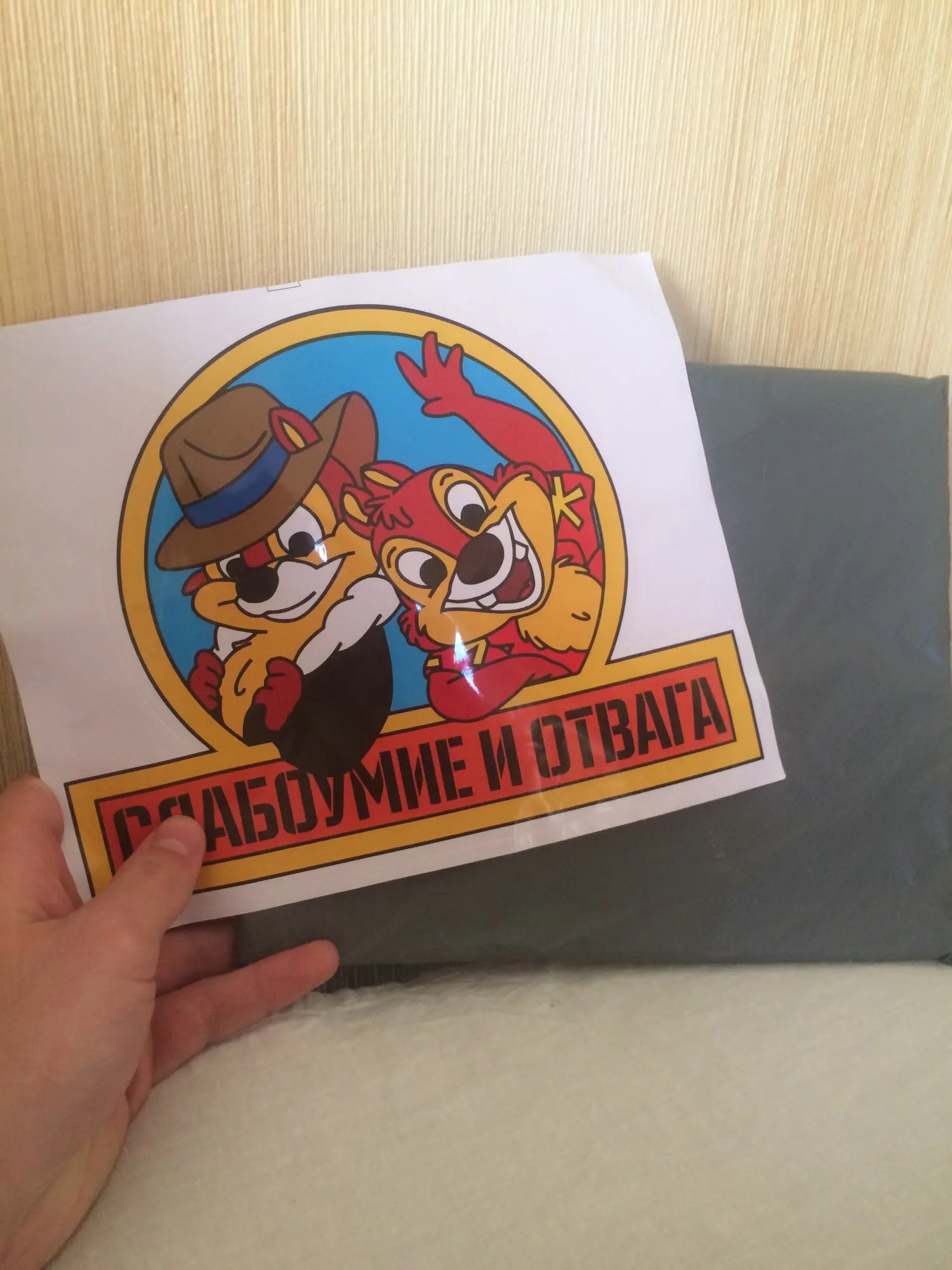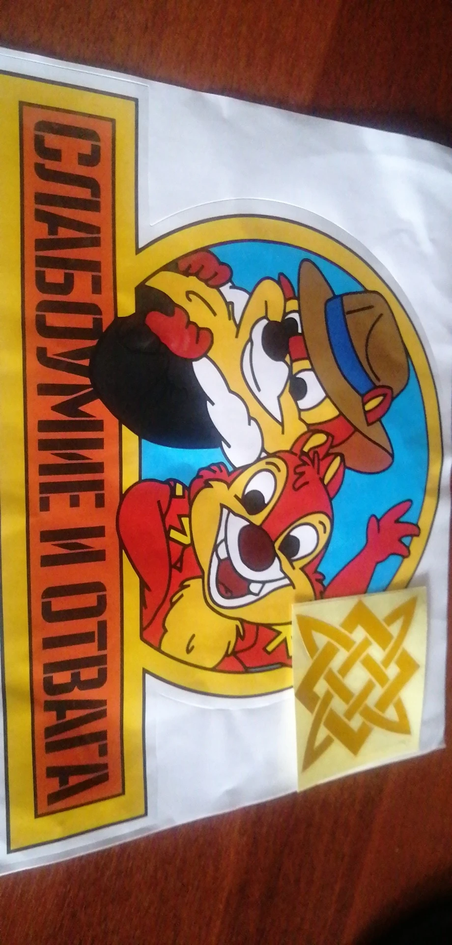За полтора месяца заказ прибыл в Тюмень. Упаковано в конверт и усилена подложкой, но все равно немножко помялась наклейка, но не критично. Продавец положил подарочек, за что респект ему. В целом, Чип и Дейл выглядят аутентично, пока куда клеить-не придумал, но хочется там, чтоб почаще вызывал улыбку этот девиз. All fine, 5 stars!