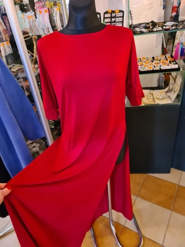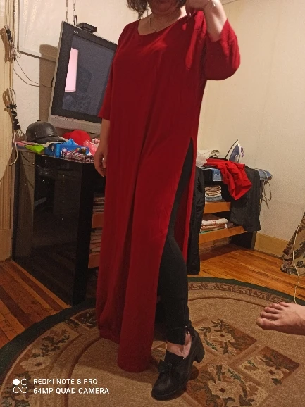 доставка в течение месяца. качество хорошее. Футболочный трикотаж с добавлением синтетики, что неплохо , все-таки верхняя одежда, а не нательное белье, но антистатик при стирке пригодится). на размер 52-54 в груди -свободно 3XL - -как и хотелось( с плеча спадает). на рост 164 - подол лег на пол (даже при10см каблуке - будет мешать ходить). но есть шикарный выход - сдрапировать с одной стороны - классный ассиметричный подол получается. И цвет не винный - а скорее насыщенный красный