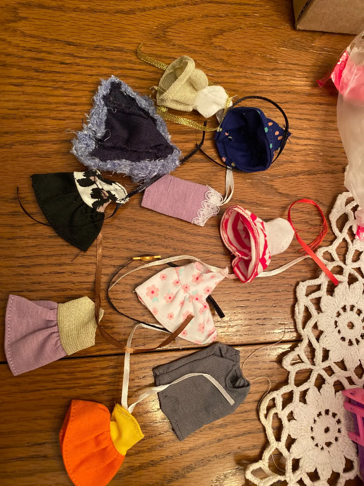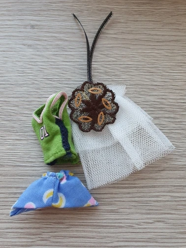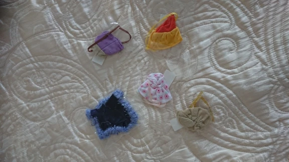 Одежда неплохая, из 5 2 платья маленькие на куклу 12 см, 2 платья чуть побольше. подошли пупсу 12 см с животиком. Все платья завязываются у шеи. Один комплект юбка и лифчик великоваты. Вобщем я довольна, продавцу спасибо