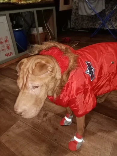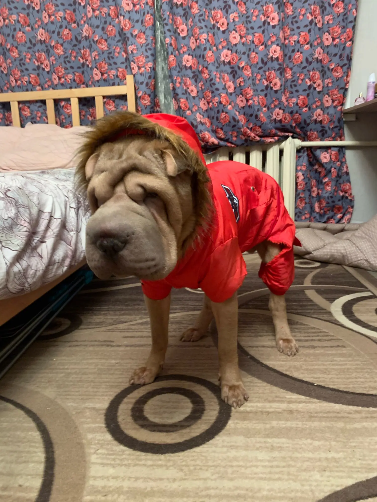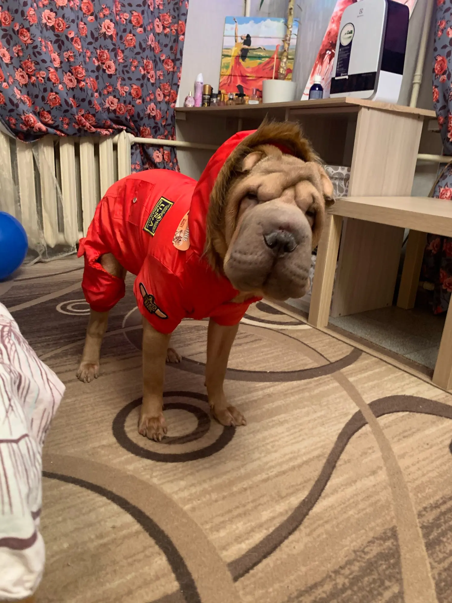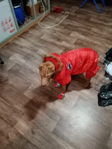 И на мальчика и на девочку, потому для кобеля слишком открыта попа. На взрослого шарпея 4xl чуть маловат, но в груди хорошо застегнулся. Нет отверстия для поводка на шее, так что капюшон только как декор