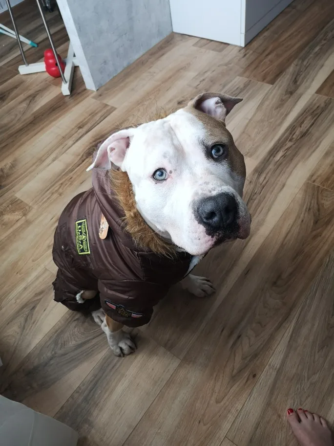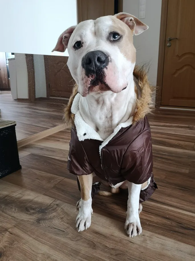 Мне понравилось, Супер тепло, хотя продавец говорит, что это нехорошо для дождя, его нужно проверить, Размер 5XL для моего пятилетнего питбуля, 30 кг идеального размера, шея около 54 см и грудь около 76, выглядит отлично, просто, ничего не торчит