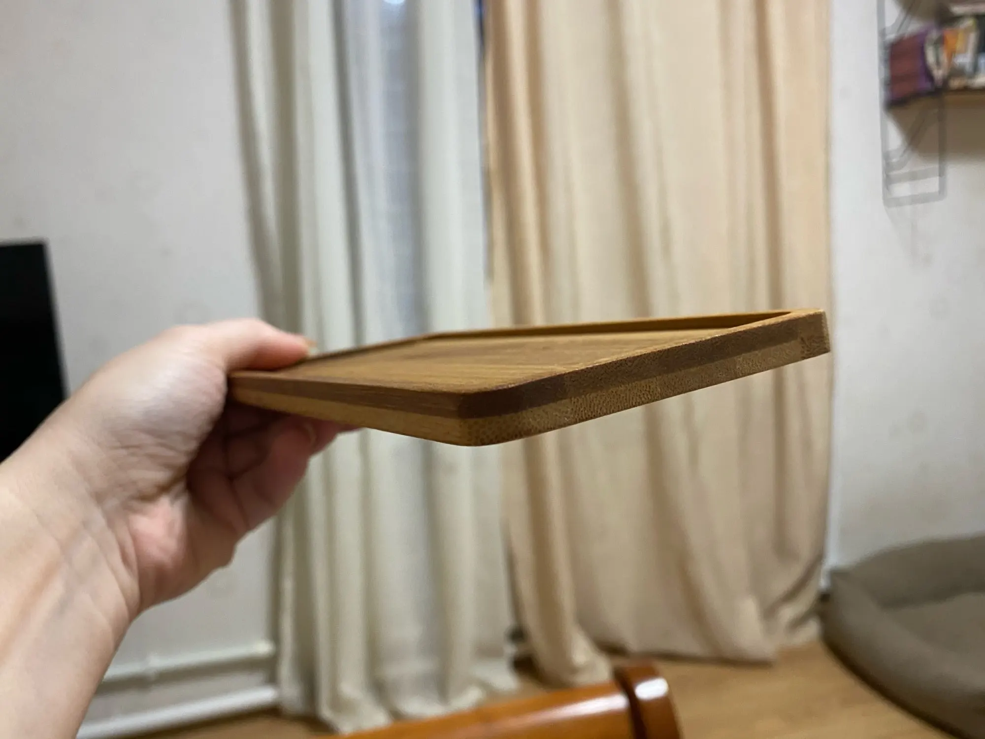 Отличная досочка, чтобы класть на подлокотники дивана под чай, например. Хотелось бы чуть-чуть шире, но кружка по диаметру входит.