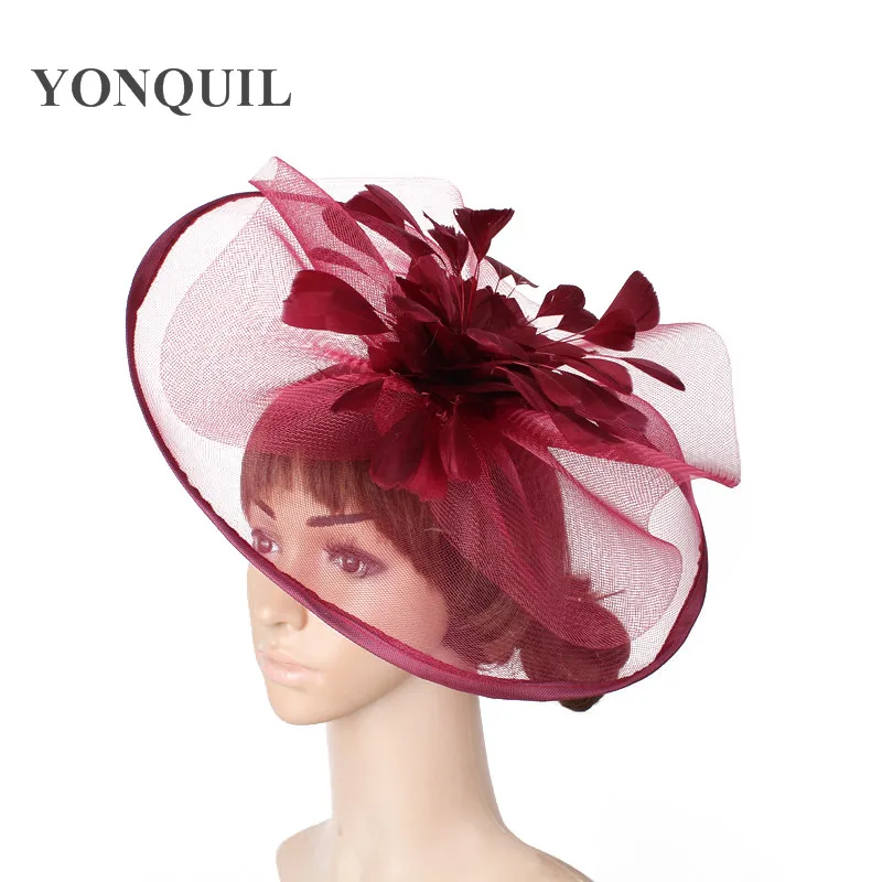 Винно-красный Вуалетка с цветком из перьев, свадебные заколки для волос и повязки на голову для женщин, вечеринка, Королевский Аскот, шляпка для свадебного и церковного шоу, отличное качество