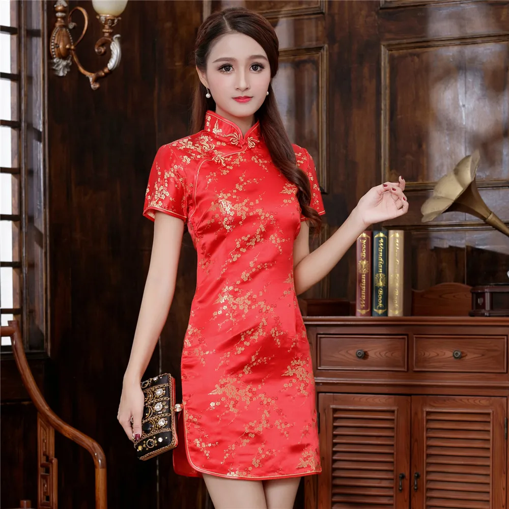 Женское классическое платье-Ципао Dragon Phenix, красное сатиновое мини-платье с коротким рукавом большого размера 3XL 4XL 5XL 6XL, китайский стиль