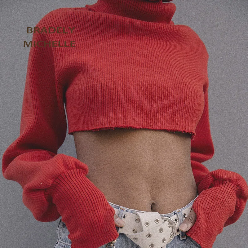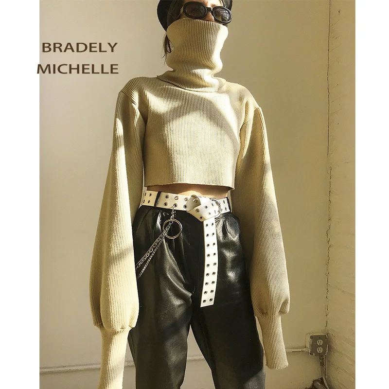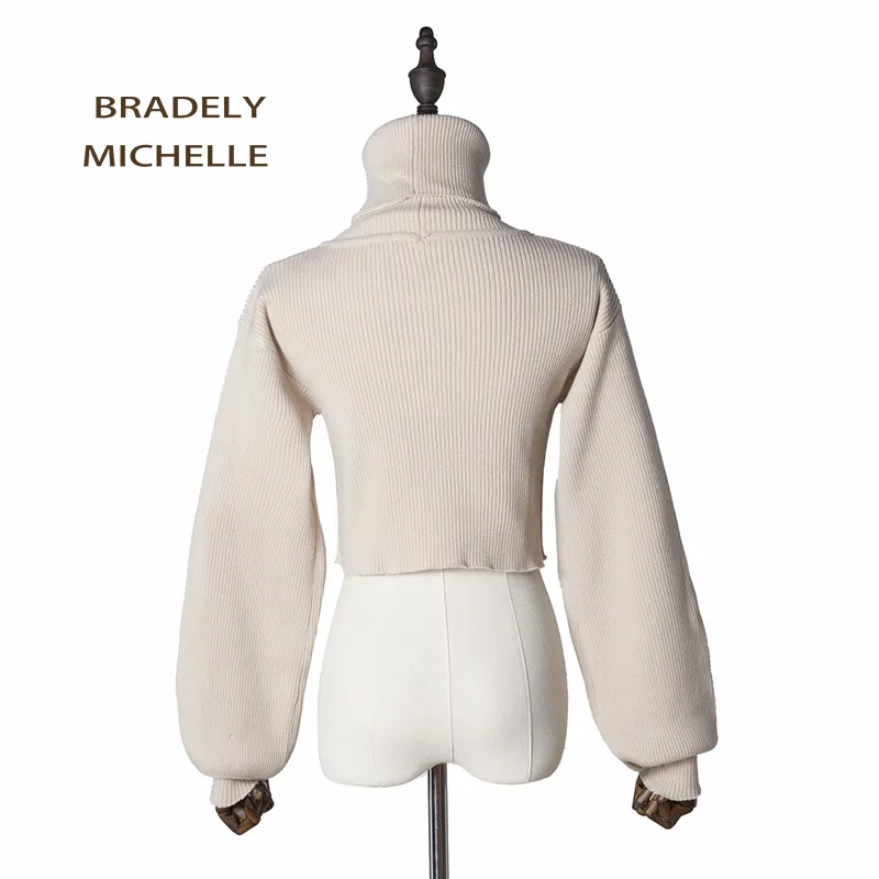 Пуловер женский трикотажный, с длинными рукавами-фонариками и отложным воротником