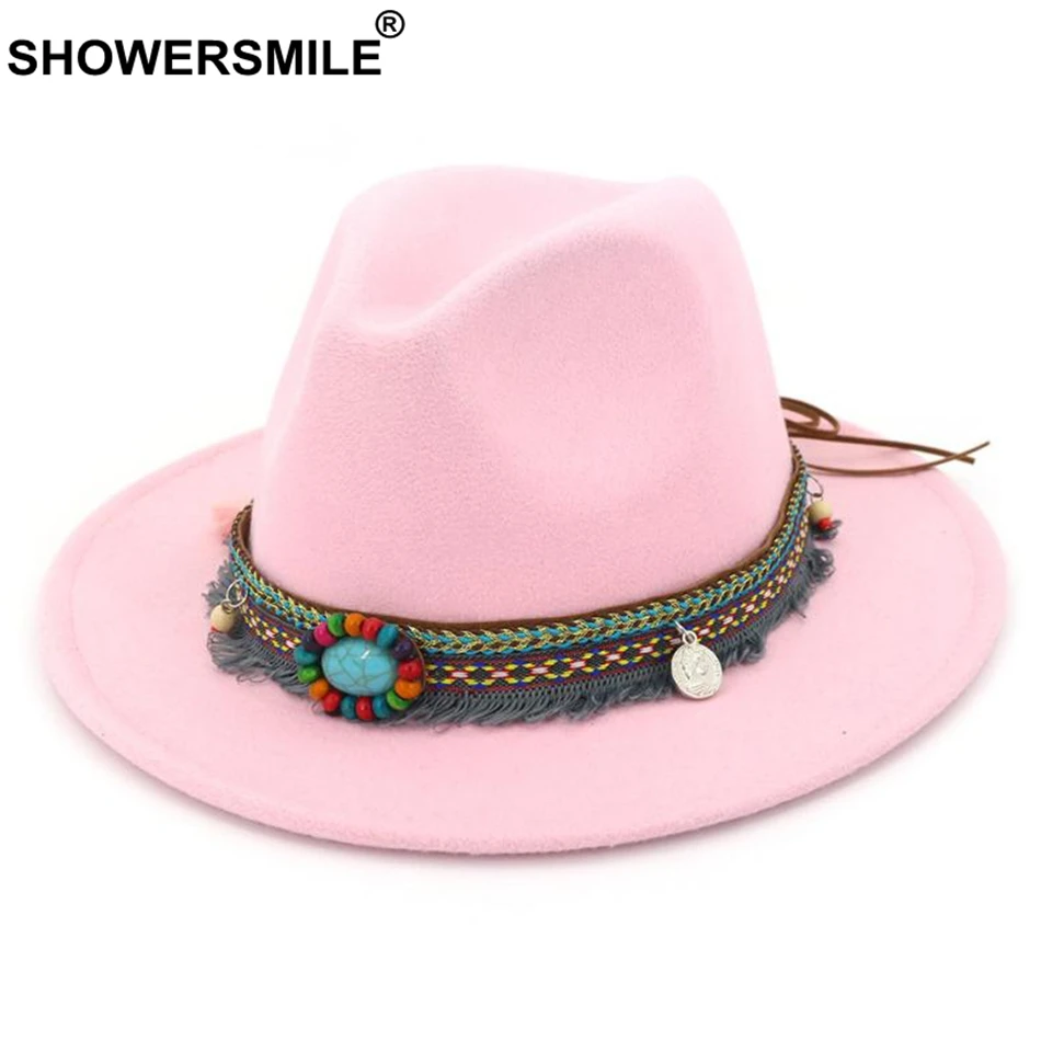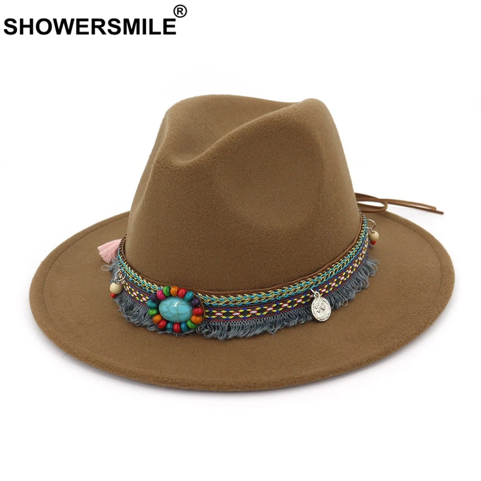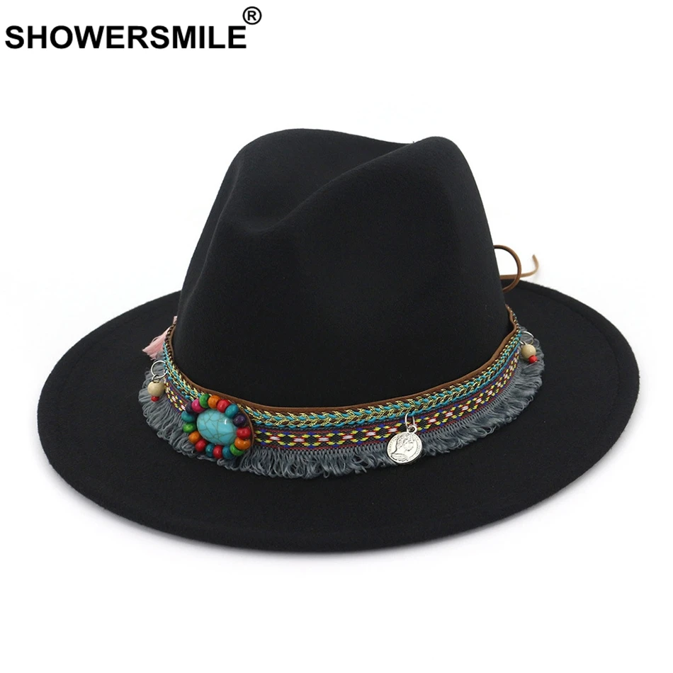 Женская винтажная фетровая шляпа SHOWERSMILE, фетровая шляпа в этническом стиле, с большими полями, красная, черная, 2021