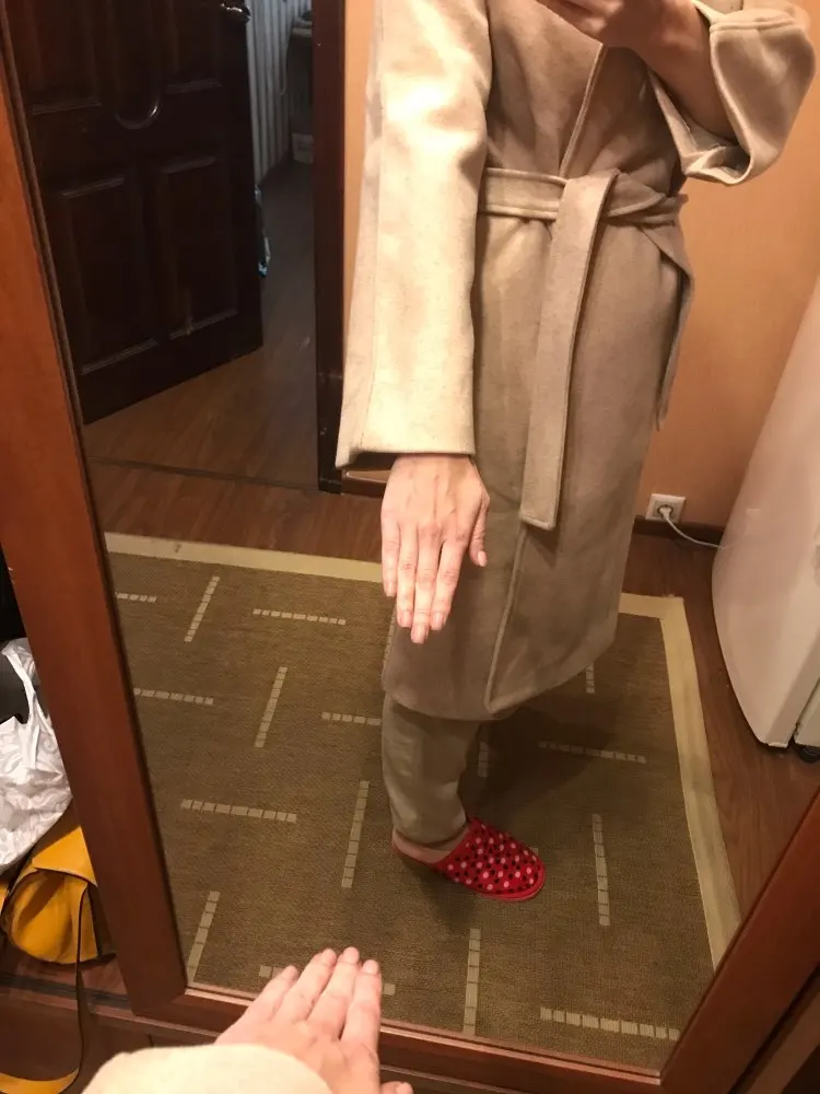 Красотень! Рост 165, 87/60/90 - село отлично, рукава не короткие, длина ниже колена. Очень мягкая ткань, чувствуется шерсть. Приятный подклад. Пальто на манер халата - т.е. застёжек н каких нет, только пояс, но нарасрах, как по мне смотрится лучше. Что очень приятно удивило - вообще нет запаха, редко такое встречаю, приятно:) Из минусов, если совсем уж придираться, немного странно смотрится подол пальто, будто сгиб ткани внизу нечётко выражен, пробовала загладить утюгом, мало помогло. Возможно буду прошивать дополнительно.