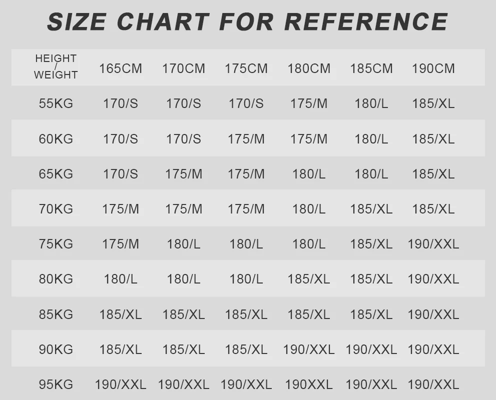 Size175 XL; 180 2XL; 185 3XL; 190 4XL