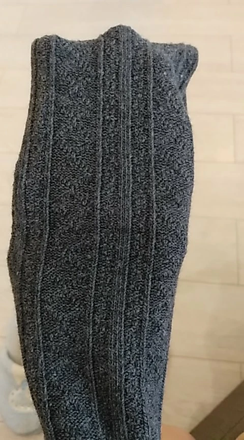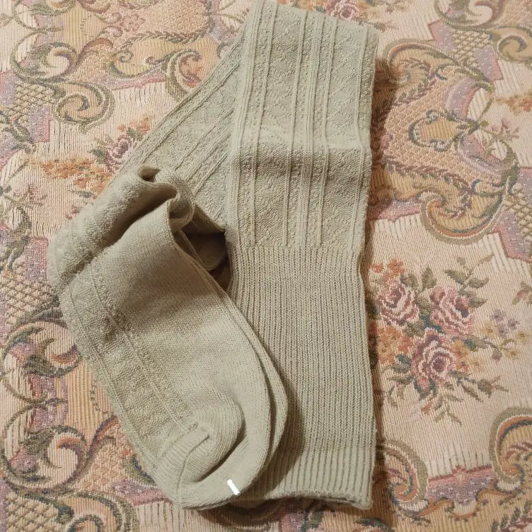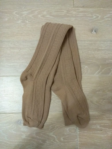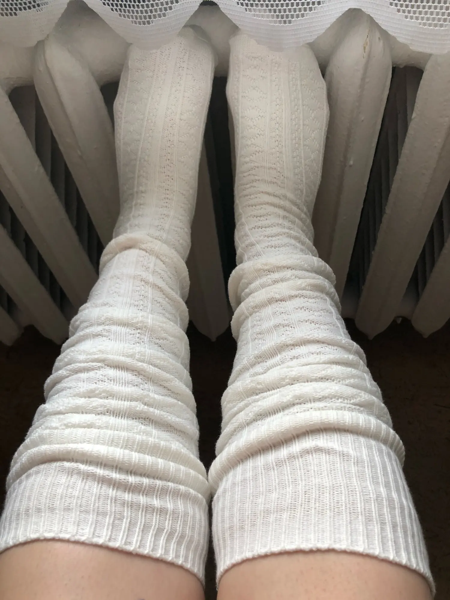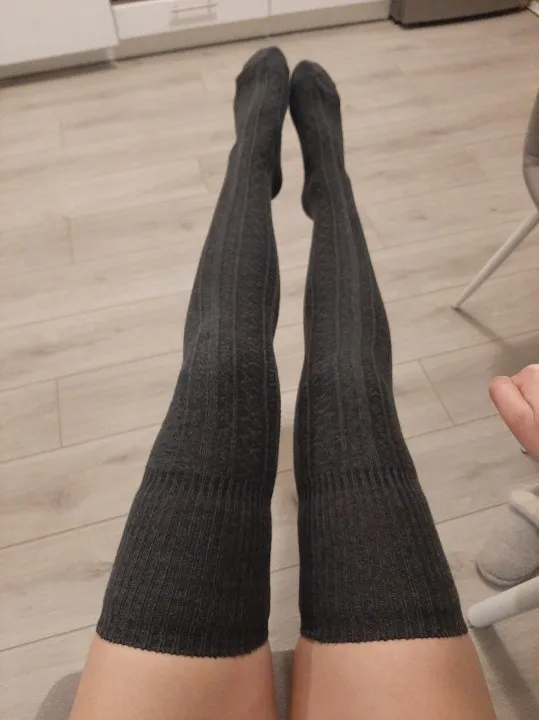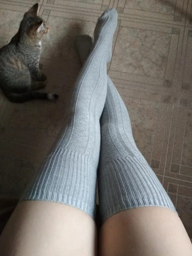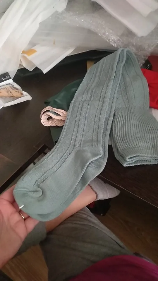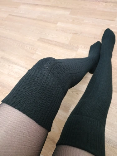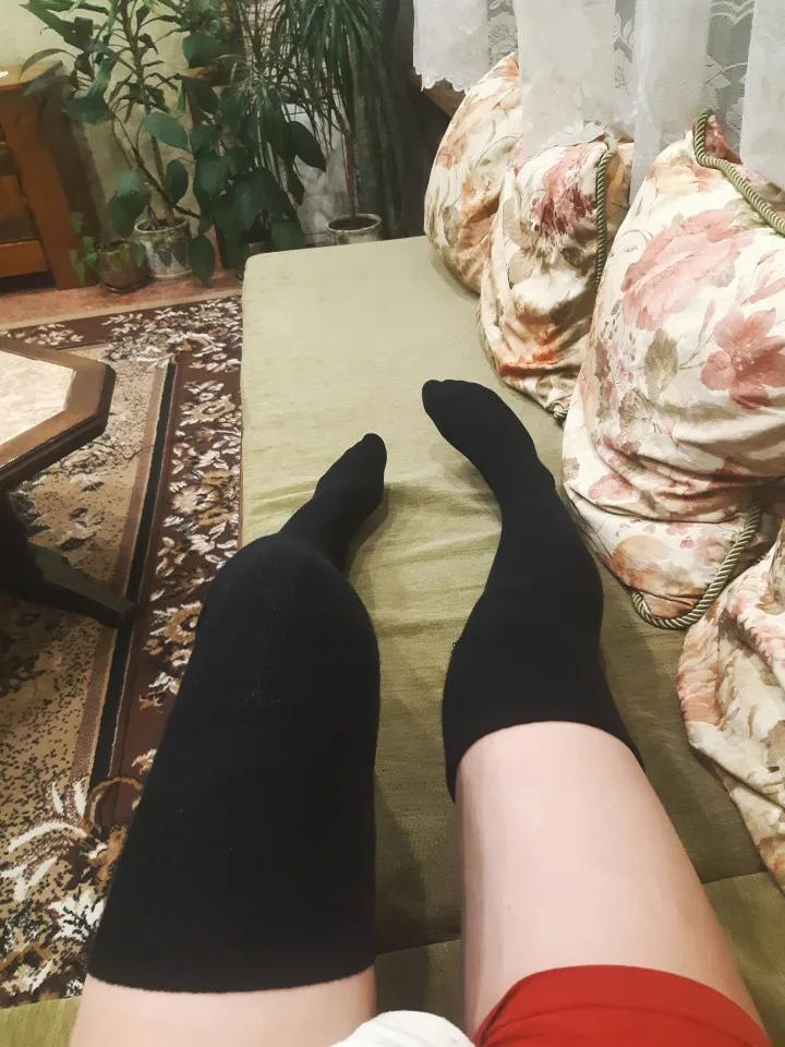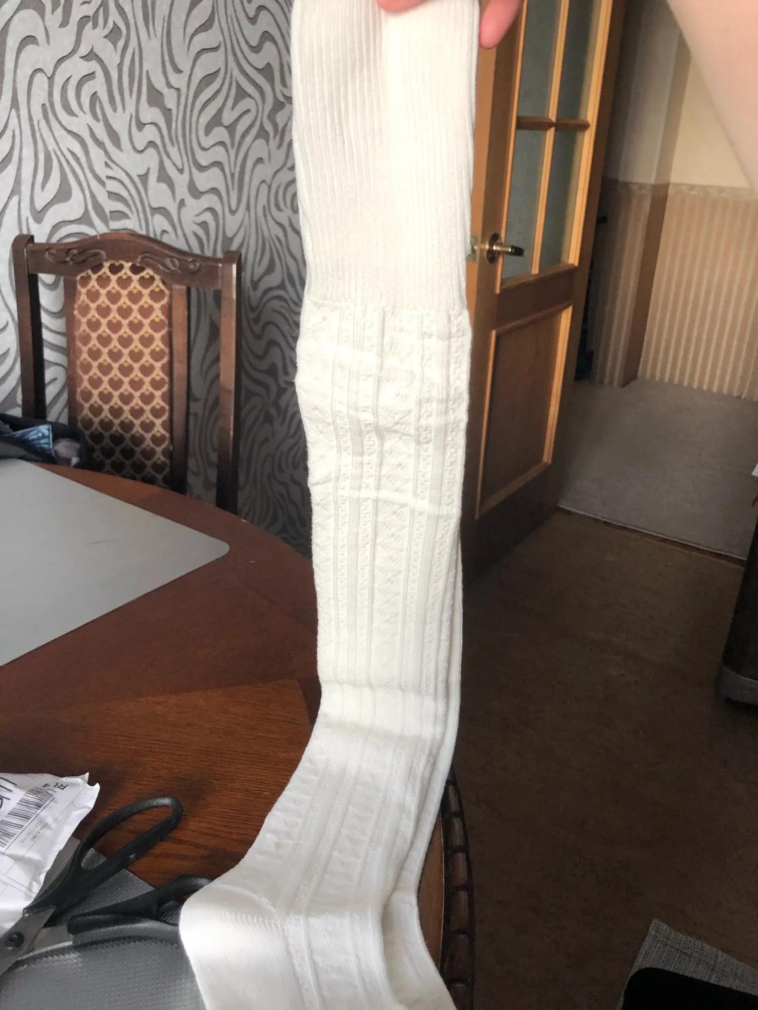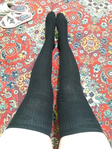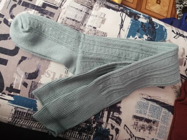 Чулки хорошенькие, качественные, тёплые, узор красивый. У меня нога худая, смотрятся хорошо, я их немного подворачиваю, так как они длинные сами по себе, на всю ногу мне(рост 162). Но сползают до колена, когда минут 10 похожу в них. Постоянно подтягивать приходится. А вообще довольна)) Нормального фото нет, только сделанное наспех)) На фото они как раз сползли, а так были до середины бедра))
