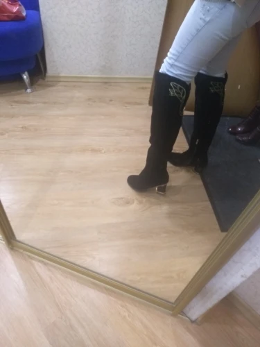 Доставка быстрая, брала для дочери. Мне на один размер большеват, а значит ей должны быть впору в колготках, только в икрах бы прошли, так что пока не знаю. Голенище шуршит, как бумага, каблук пластмассовый,вышивка понравилась,дороговато для такого качества,думаю на сезон.