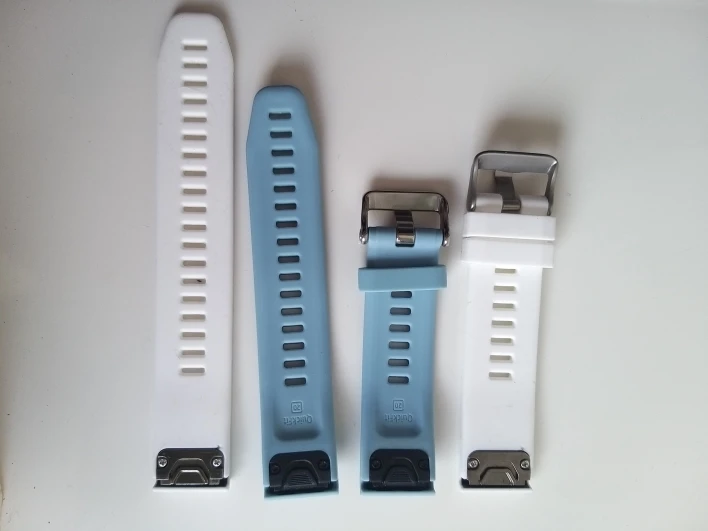 Мягкий силикон, не доставляющий дискомфорта. Застёжка серебряная, матовая. Длина 8 и 13 см, что больше, чем у оригинального ремешка Fenix 5s plus, но даже для узкого запястья будет норм, т.к. есть 2 фиксатора для хвостика ремешка. Система быстрой смены ремешка выполнена из тёмного металла, сквозь белый ремешок немного просвечивает. Работает мягче, чем оригинальная пластиковая, не знаю минус это или плюс, но держит часы хорошо, одну пробежку-тест уже прошёл. Отдаёт лёгким запахом горелых проводов, но, надеюсь выветрится. В комплекте 2 отвёртки, для замены ремешков они не нужны, для для ТО часов пригодятся :-) Для стоимости ремешка он шикарен! Спасибо продавцу, назаказываю ещё, под все наряды и настроения))