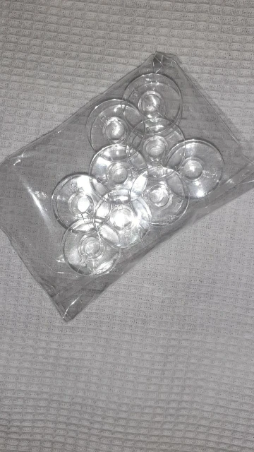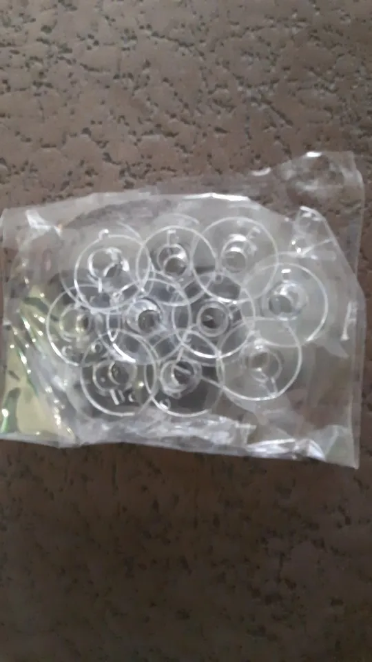 Все отлично, доставка недолгая.Прозрачные шпульки удобные-видно сверху, сколько осталось нити, есть отверстие для намотки нити, и шума при работе от них меньше,чем от металлических.