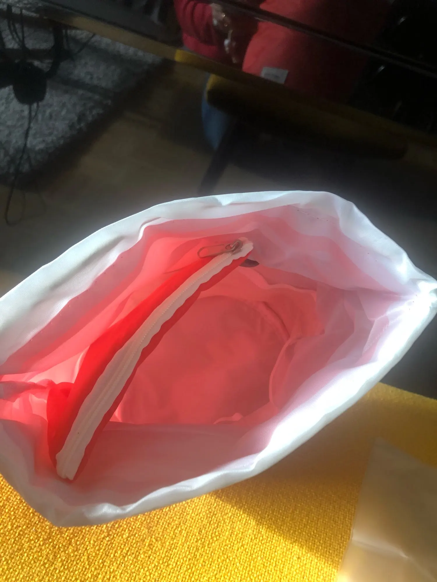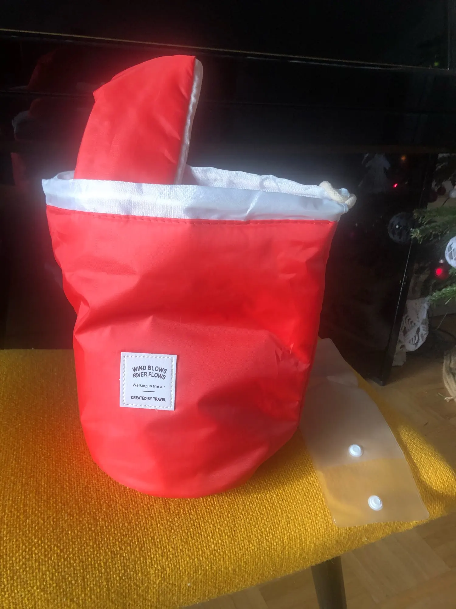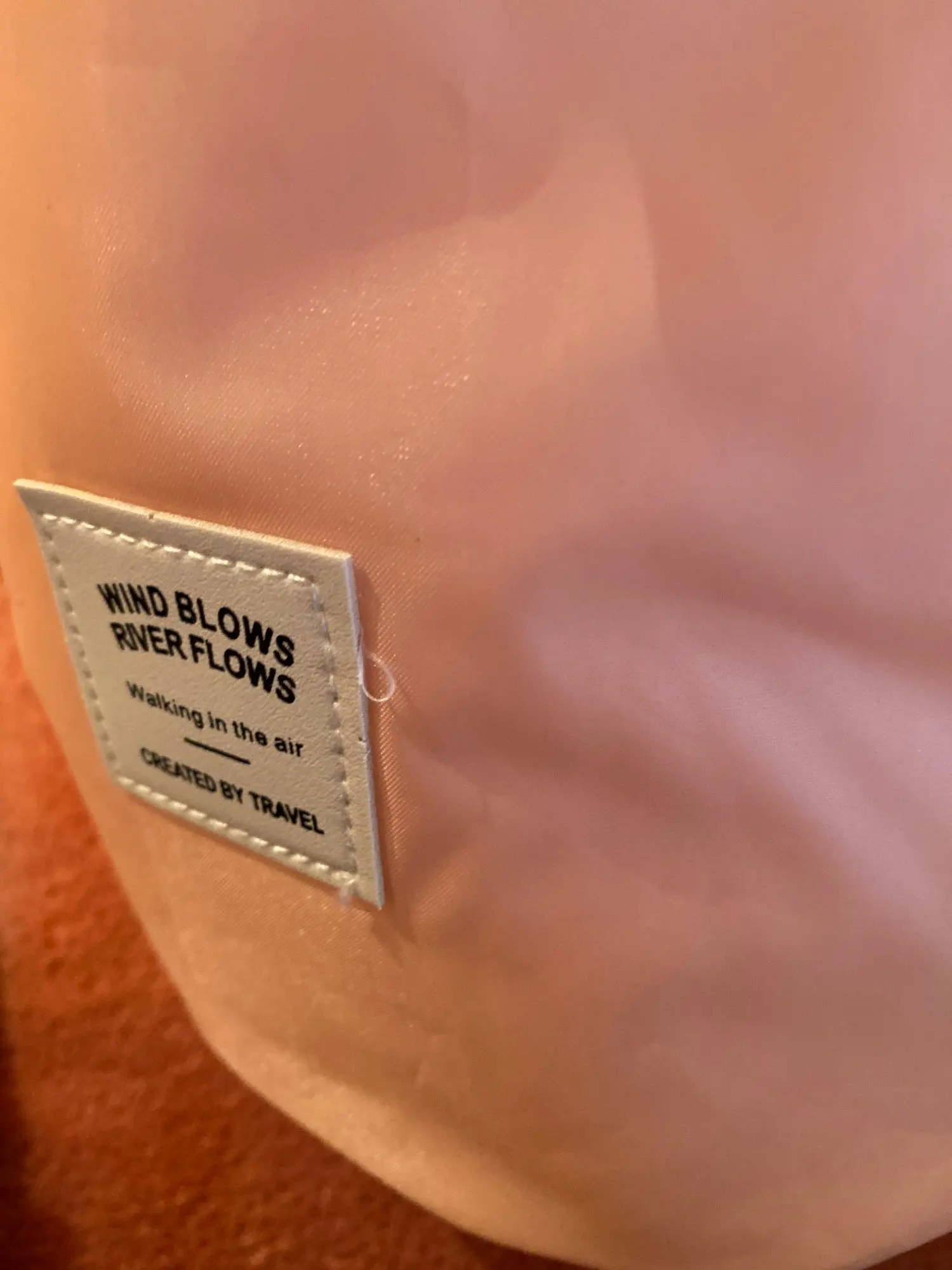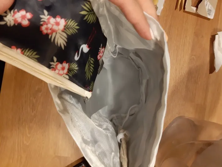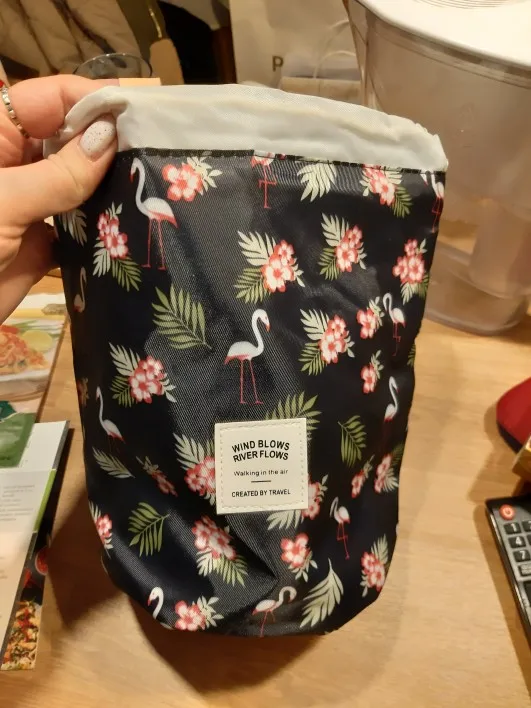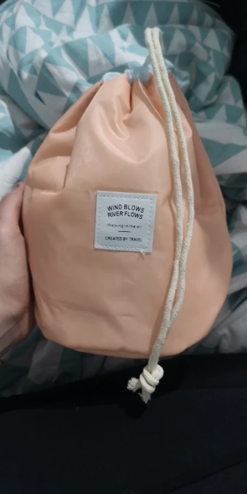 Выглядит как на картинке, но большие вопросы к качеству. Надпись на нашивке смазанная, ткань какая-то непонятная, похожа на брезент по плотности, затягивается шнурок туго, ткань собирается сложно. Доехала косметичка за месяц.