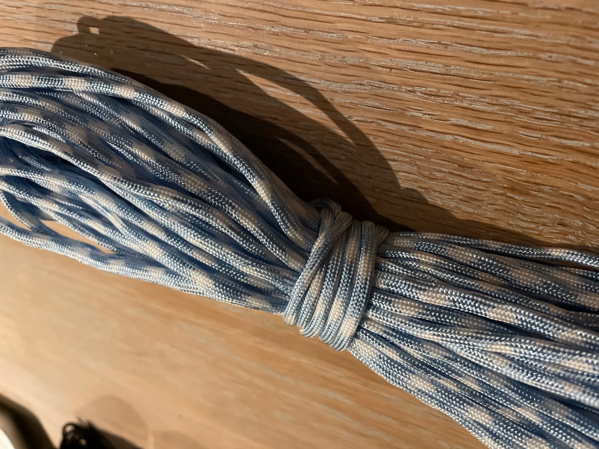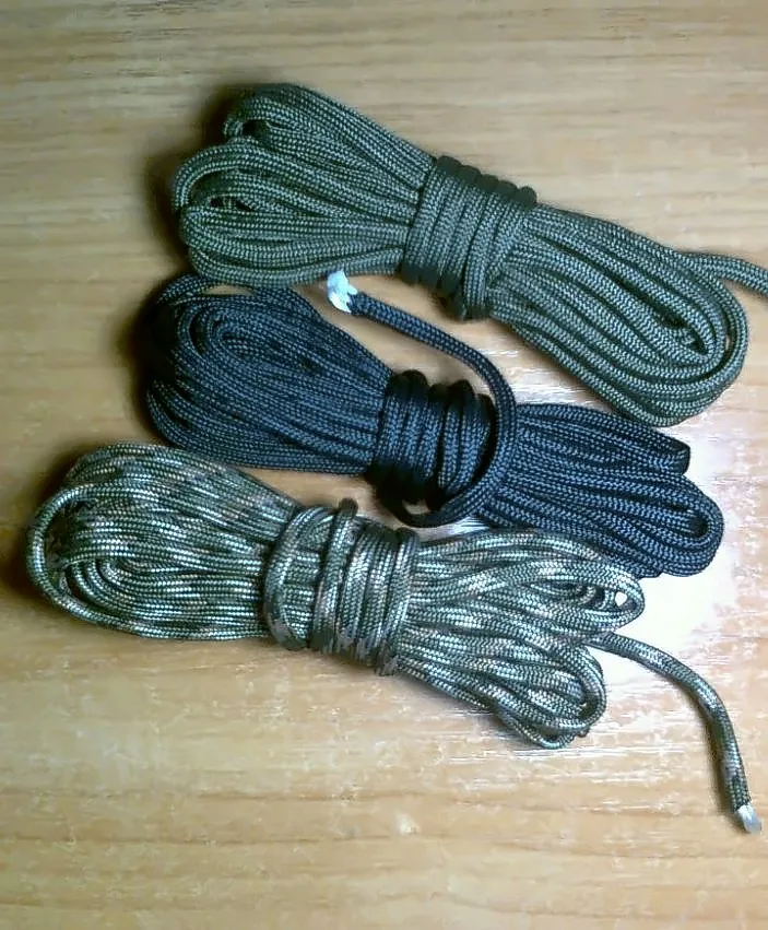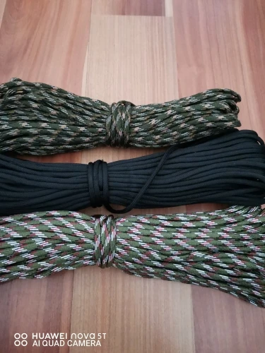 Не покупайте, это поддельный Паракорд! Парашютные Шнуры Плетеные из 32 нитей и ядро состоит из семи двухслойных нитей. Этот Паракорд имеет только пустую внешнюю оболочку, ядро полностью отсутствует! Из-за этого Паракорд не круглый, но плоский, он очень легкий и слабый. Не подходит для переноски любого веса! Не покупайте этот поддельный товар!