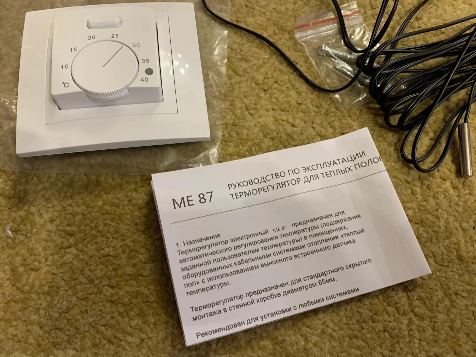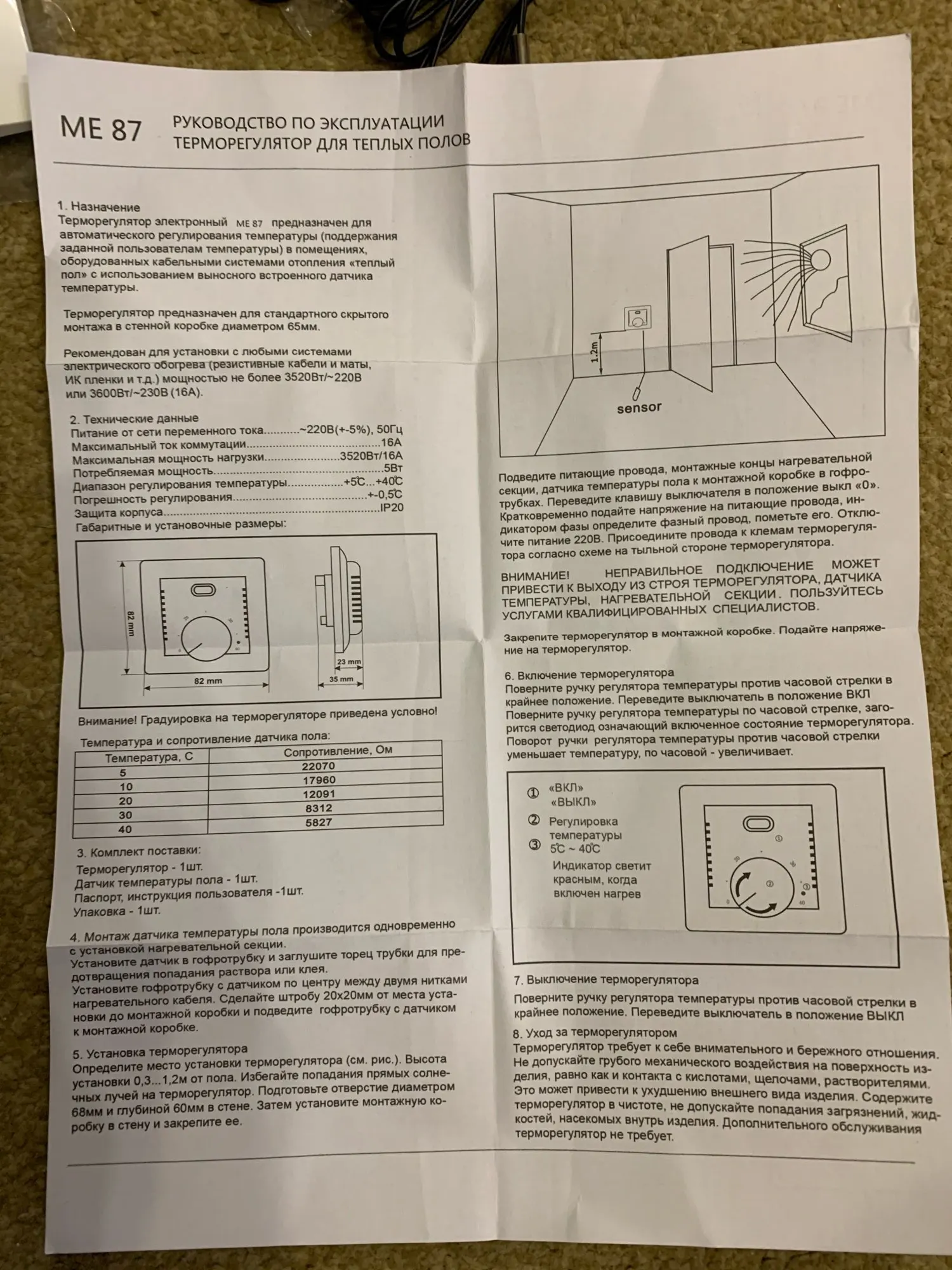 Заказ шел 50 дней почтой Мист Экспресс. На вид- все круто. Фабричное исполнение. Как себя покажет в деле- посмотрим. Сопротивление датчика при комнатной температуре- 10 кОм. Сопротивление холодного кабеля мата- 317 Ом на 1 кв. метр нагрева.