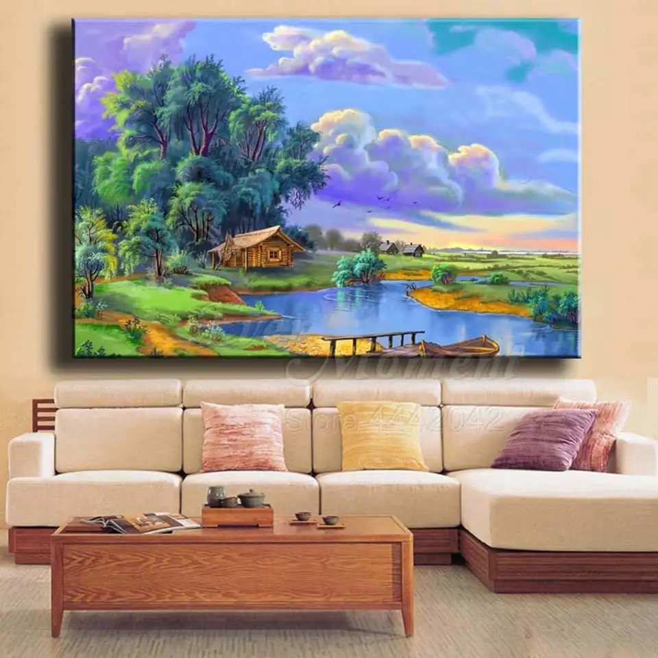 Когда-нибудь момент алмазов картина природа река дом деревья крестом мозаика, алмазная вышивка 5D DIY рукоделие S2F696