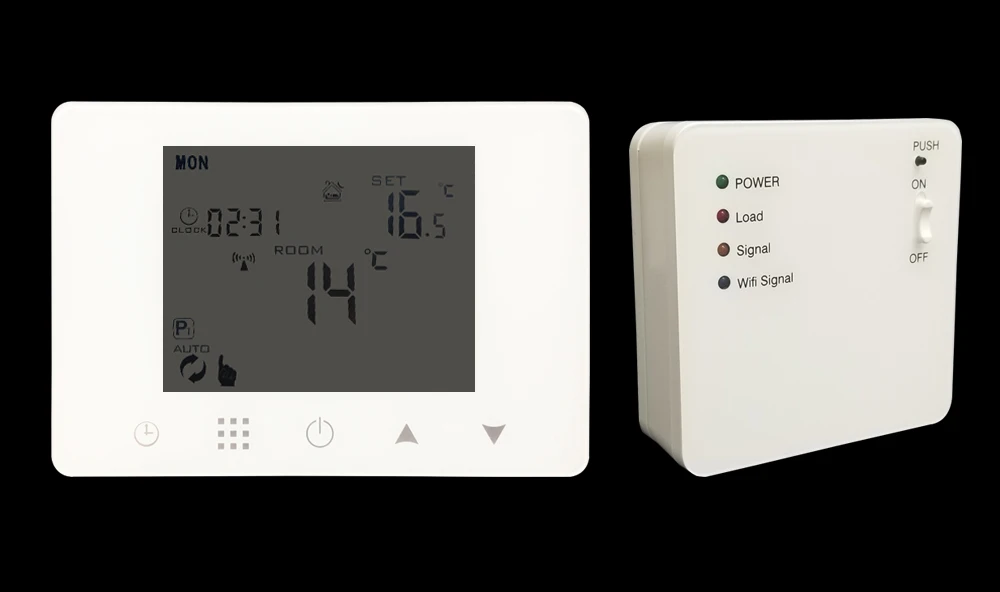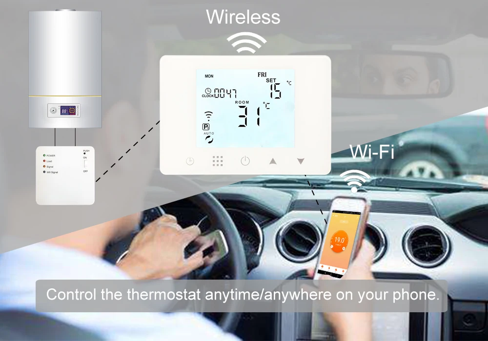 BGL09RF-WiFi термостат для нагрева газового котла имеет функцию беспроводной связи RF и Wi-Fi. Весь набор содержит корпус термостата, приемник и вилку. Когда покупатель получит термостат, он должен установить ресивер со своим газовым котлом. Корпус термостата может быть доставлен в любую комнату, которую вы предпочитаете. И когда покупатель не дома, он может использовать телефон для управления термостатом. BGL09RF-WiFi термостат для газового котла очень удобен.
