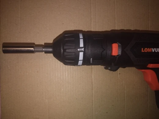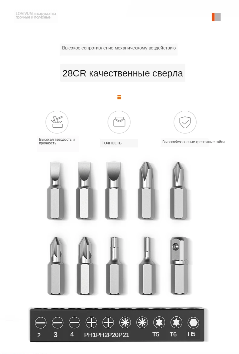 Очень быстрая доставка - 11 дней до Москвы. Товар соответствует описанию. Покупкой довольна.В работе пока проверяла мало. Но все насадки работают. Наблюдается небольшой люфт биты при вращении. Но работе это не мешает.