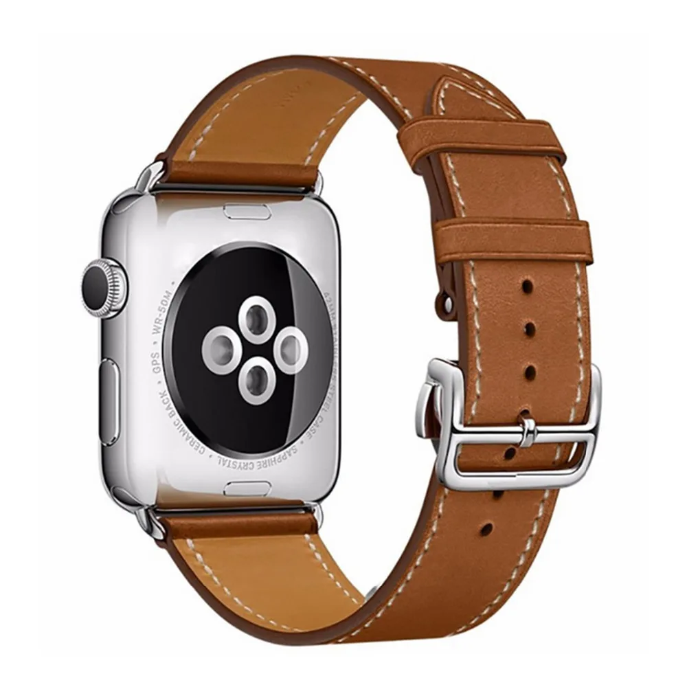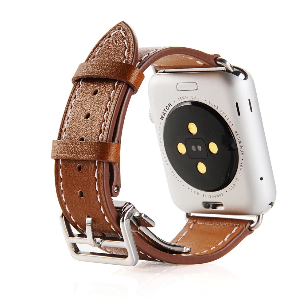 -Персонализируйте свой выпуск для Apple Watch с помощью этого браслета из натуральной кожи. -Внешний вид из натуральной кожи и внутренняя отделка из микрофибры гарантируют более комфортное ношение. Стильный Изящный и элегантный вид делает его идеальной заменой ремешка для Apple Watch -Ремешок поставляется с наконечниками Apple Watch на обоих концах, которые фиксируются на интерфейсе Apple Watch Точно и надежно. Легко устанавливается и снимается. -Металлическая регулируемая застежка с пряжкой готова к замене браслета. 6 отверстий для тонкой настройки и удобного ношения -Подходит для запястья 170-200 мм.