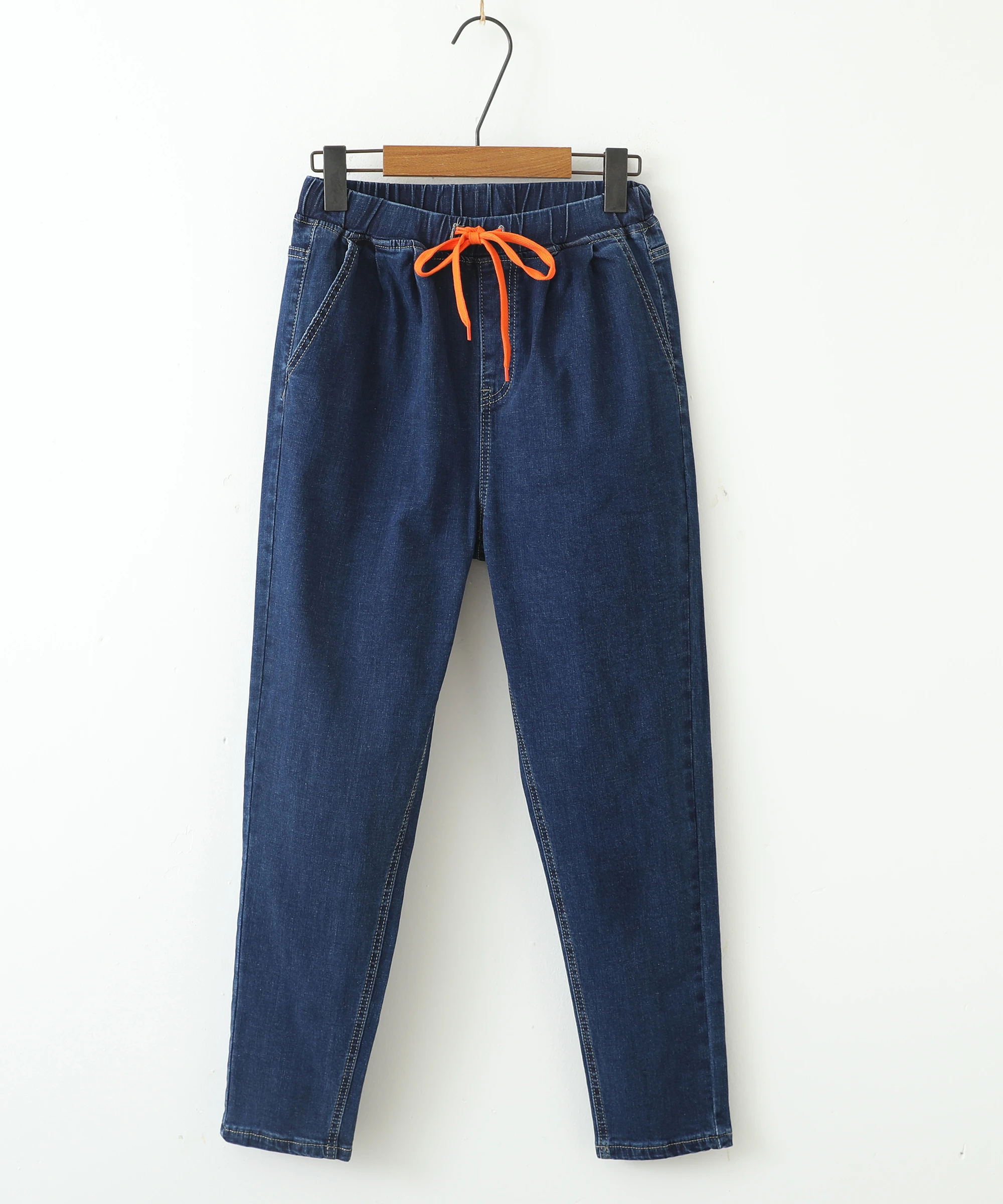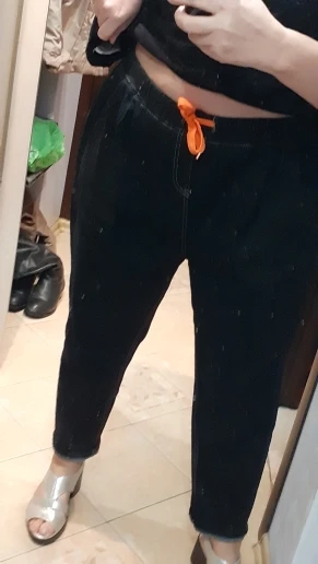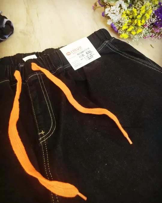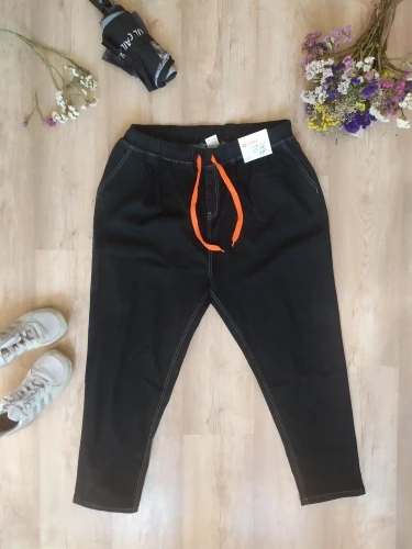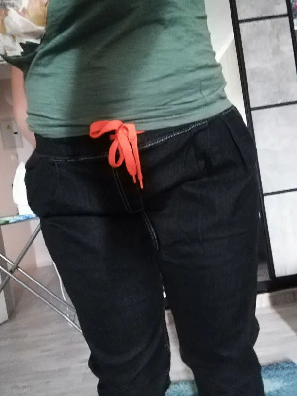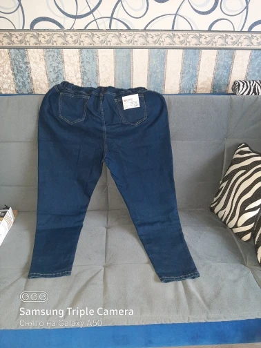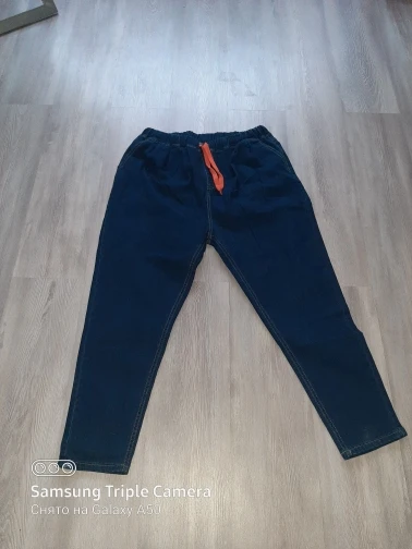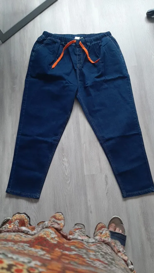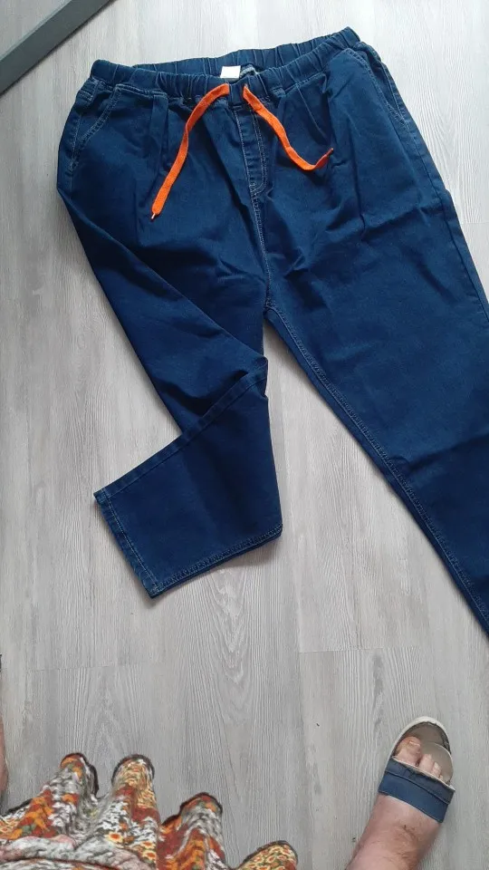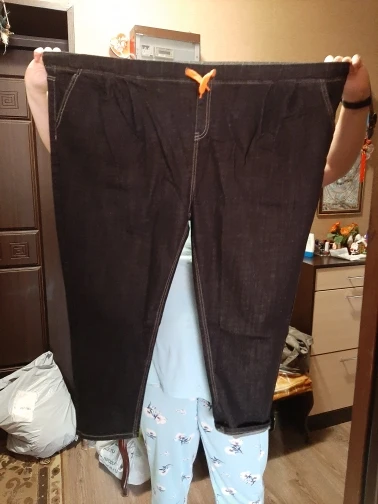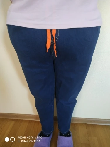 Доставка три недели. Ткань не дубовая, но и не совсем тоненькая, нормальная. Пошиты неплохо, жаль только, что отстрочка невнятного цвета - не желтая, не белая, а так - бежевая. В размере 7xl на талию 100 бедра 126 - свободно, можно было на размер меньше брать, но так даже лучше - не обтягивает. От колена вниз - сидят по ноге, не внатяжку, как лосины, но и не болтаются. На рост 163 длина в самый раз, есть даже немного припуск на обувь или можно один раз подвернуть - будут по верх кроссовок. Шнурок на талии прикольный, но логичнее будет вдеть вместо него широкую резинку - пояс позволяет. Мне джинсы однозначно понравились.