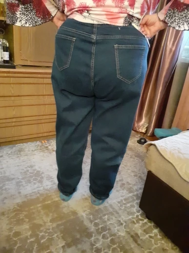 Джинсы пришли очень быстро. На российский размер 56-58, можно было взять 5XL свободно будет, типа оверсайз. У кого живота нет, можно и 4XL. Материал хороший, не тонкий. Я довольна. Рекомендую.