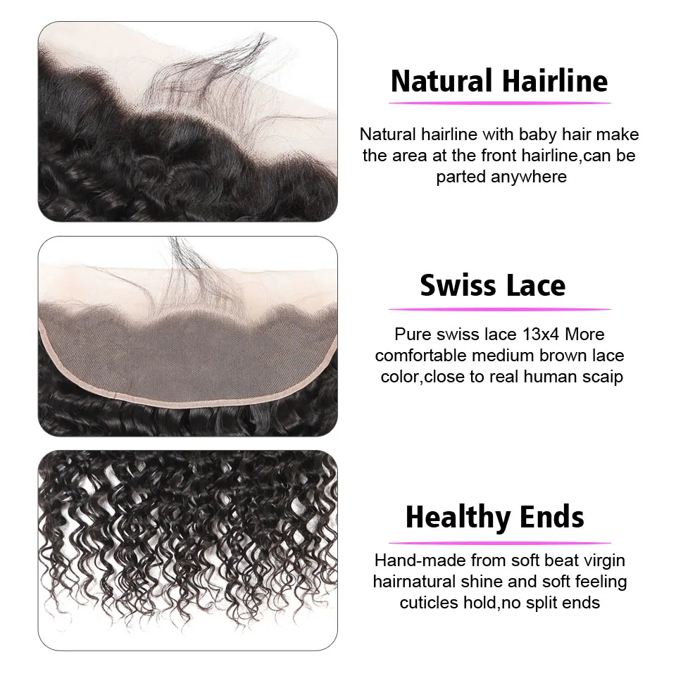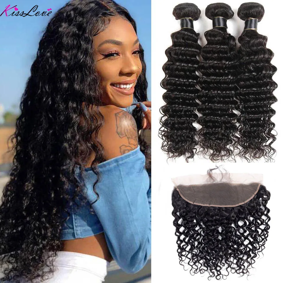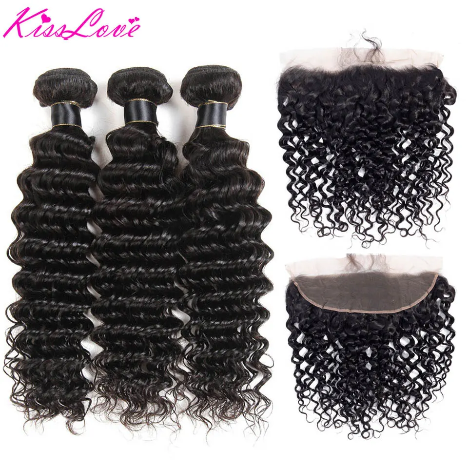 Kiss Love бразильские волосы с глубокой волной, пучки с фронтальной 100% человеческими волосами, волнистые фронтальные волосы с пучками, волосы без повреждений