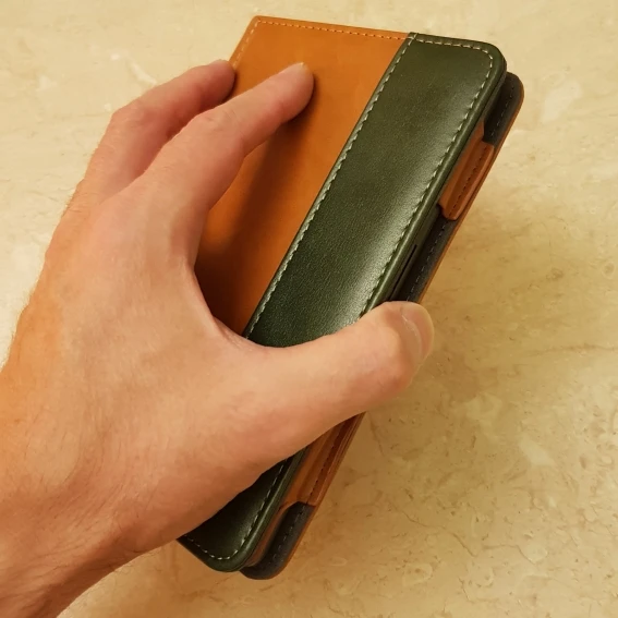 Очень добротный чехол, из качественных материалов, цвет просто супер, в жизни лучше, чем в описании. Легко складывается в книжку. Удобно держать в руках (в том числе в одной руке). Лёгкий. Не громоздкий, в описании казался больше. Все отверстия доступны. Швы ровные. Из минусов - на джойстике вниз нажимать не удобно, края мешают.