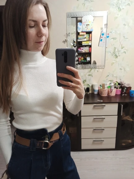 Водолазка хорошая, мягкая. Хорошо тянется, горло не давит. Высоким девушка будет коротковата. Мой рост 156 прям впритык можно было бы и подлинее чуть чуть, но и так нормально. Качество хорошое.