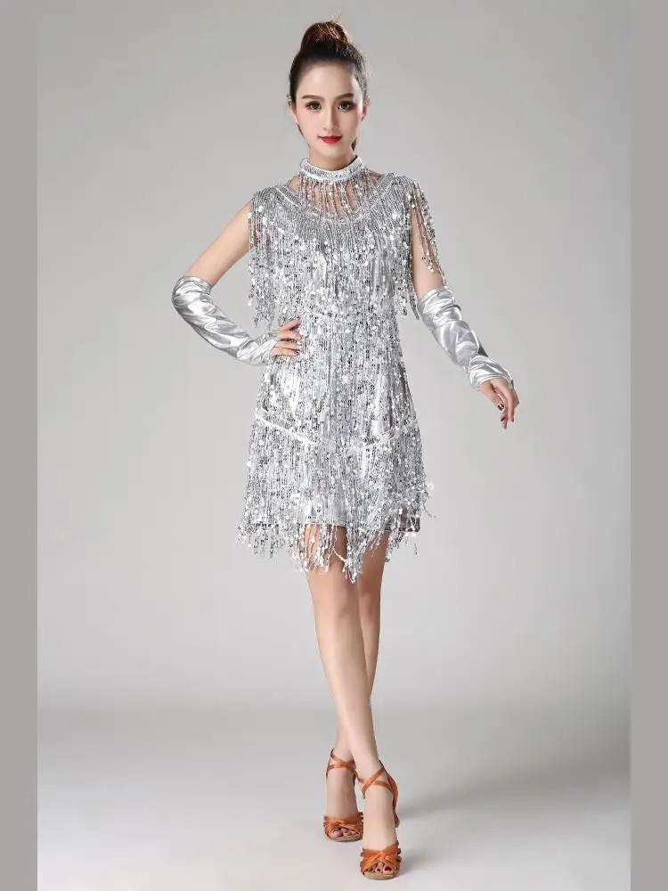 Платье для латиноамериканских танцев для девочек, блестящее серебристое платье с бахромой и бахромой