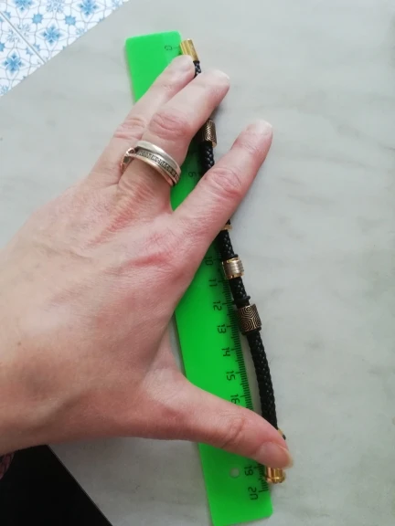 Прекрасный товар высшего качества. Сын в восторге. Окружность браслета размера 17 составляет 18,5 см в закрытом состоянии. На линейке видно, что длина браслета 19,5 см, но 1 см при закрытии уходит в замок. Шармы не болтаются, сидят крепко. Но при желании шармы можно двигать. Доставка быстрая. Спасибо продавцу!