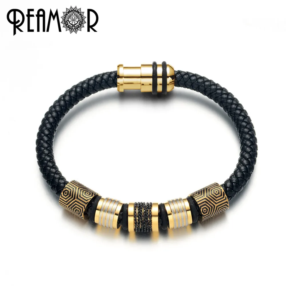 Мужской браслет из натуральной кожи REAMOR, черный браслет из нержавеющей стали с магнитной застежкой и золотыми бусинами, винтажный мужской браслет