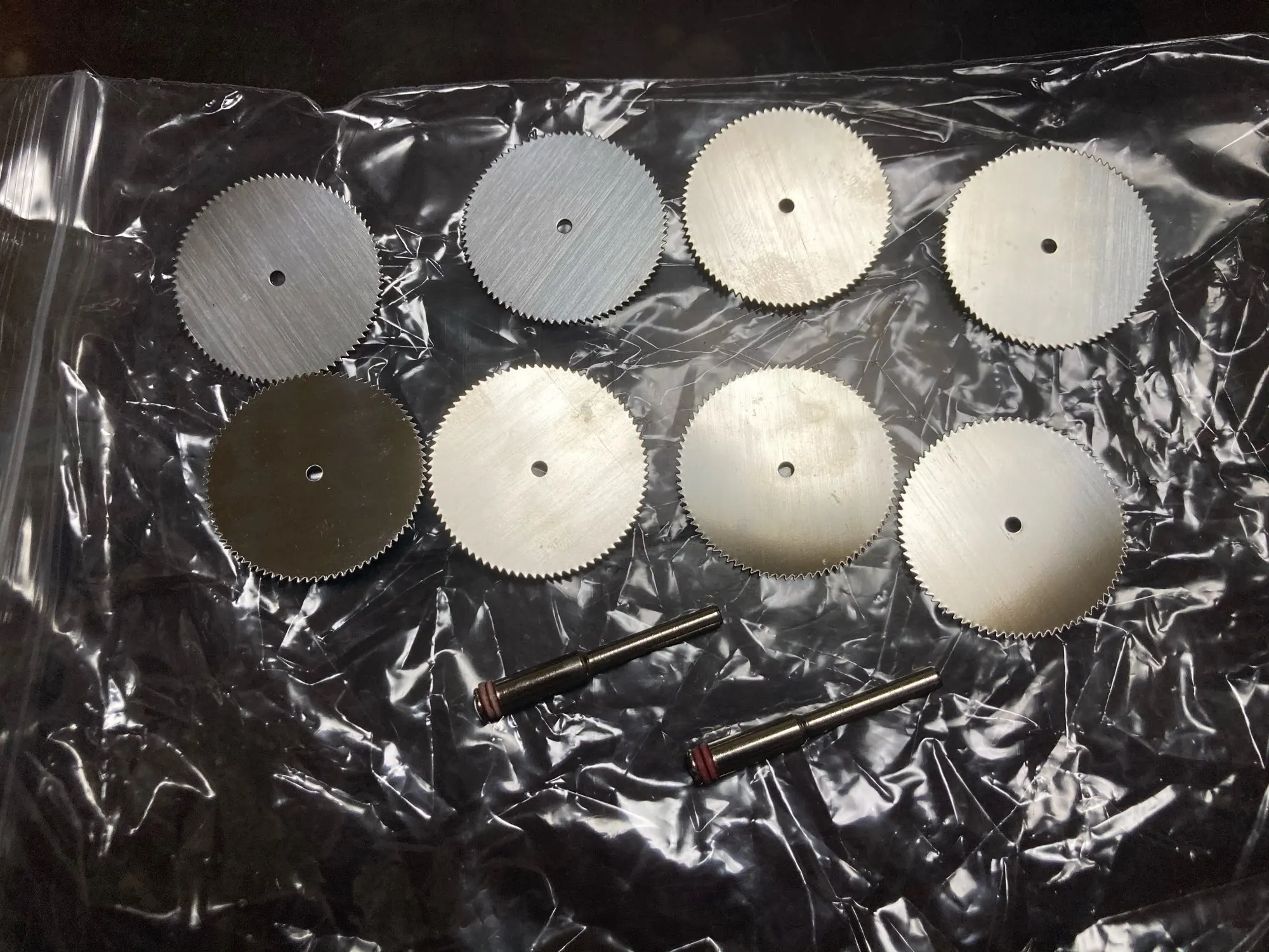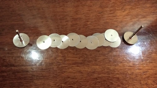 Диски из тонкой жести, консервная банка толще. Вырублены без дополнительной обработки. На макро видно, что зубы не острые, а закругленые. Подходит для работы с мягкими породами дерева и мягкими пластиками толщиной до 8-10 мм, с более плотными пластиками и деревом до 5 мм. Ширина пропила меньше 0,5 мм. Доехали все целые, не гнутые. За 100 руб. норм, но пилят, как латунные шестерни из старого будильника "Заря". Можно и на барахолке поддержать отечественного производителя.