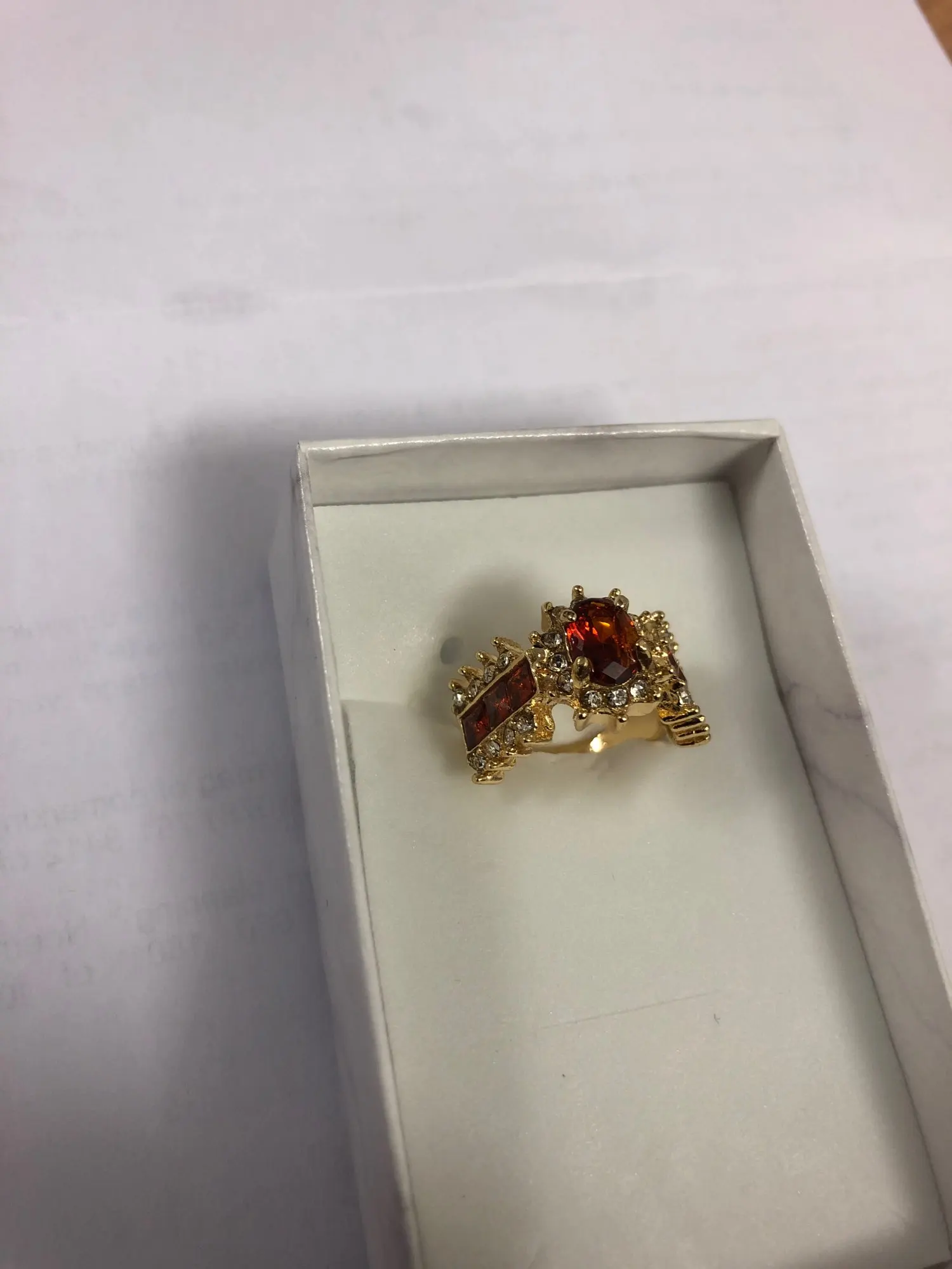 Прекрасное,необычное кольцо. Камни все на месте, центральный явно не пластик, размер скорее 17.5,чем 18. Цвет металла конечно далеко не Золотой,но знаете,дешевкой не выглядит. Доставка порадовала,не очень долгая. Продавцу большое спасибо!!!