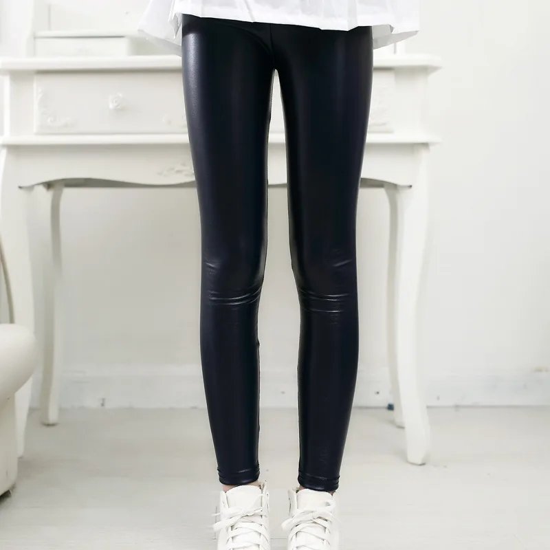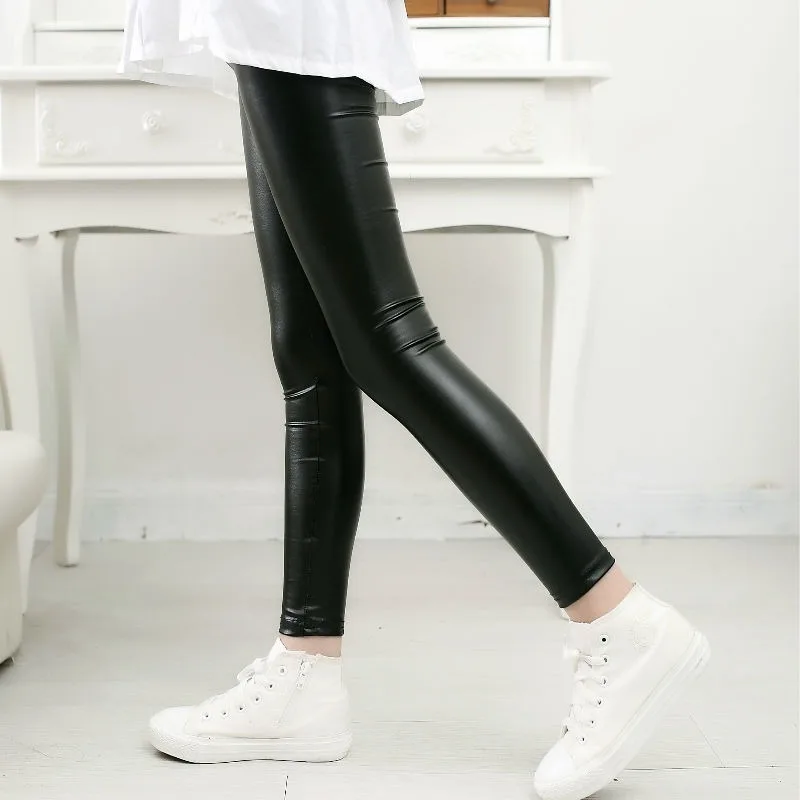 Леггинсы для девочек, черные кожаные, на весну-осень, От 2 до 12 лет