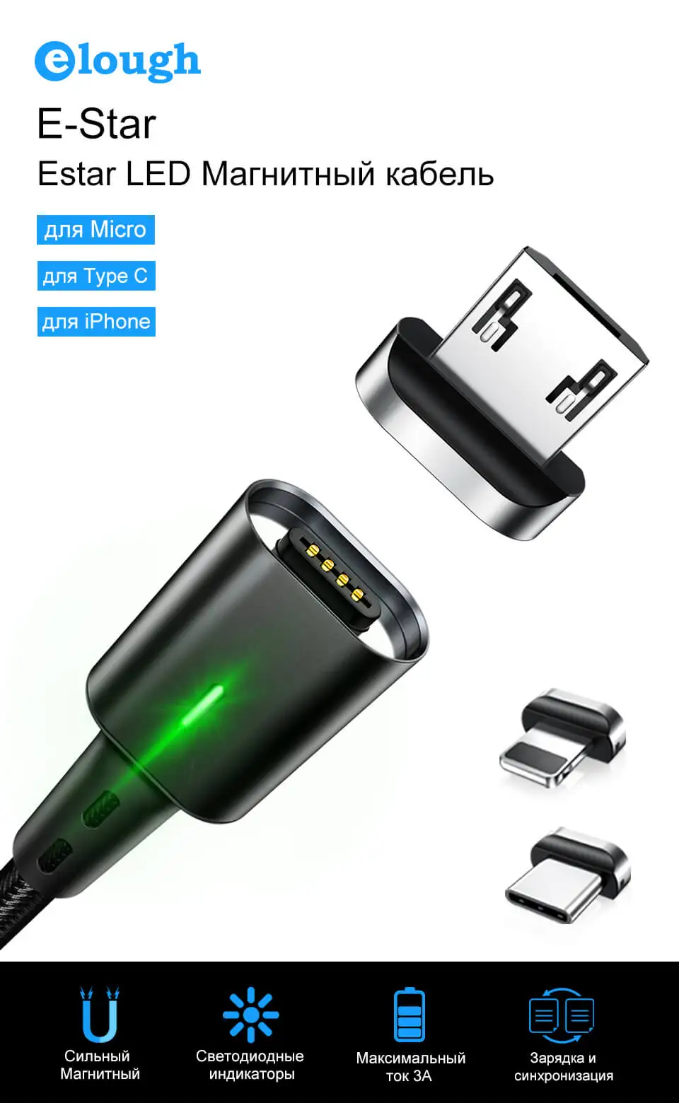 Магнитное зарядное устройство Elough с Micro USB-кабелем для iPhone 8, POCO, X3, Xiaomi, 3,0, 4,0