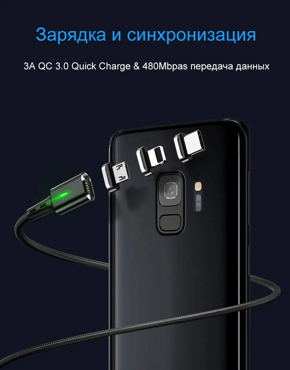 кабеля просто отпад, в машине прикрепил к держалке - теперь просто положил на нее телефон и он сразу заряжается. qc 9v поддерживает, а больше и не надо, фоточки на ноут также сливаются, значит передача данных функционирует. при этом и магнитный наконечник вертел на 180 и кабель светодиодом и к себе и от себя - работает всё в любых положениях. заказывал 2м кабели т.к. привык что они "маломерки", но тут реально длинна кабелей по 206 см от разъема до разьема