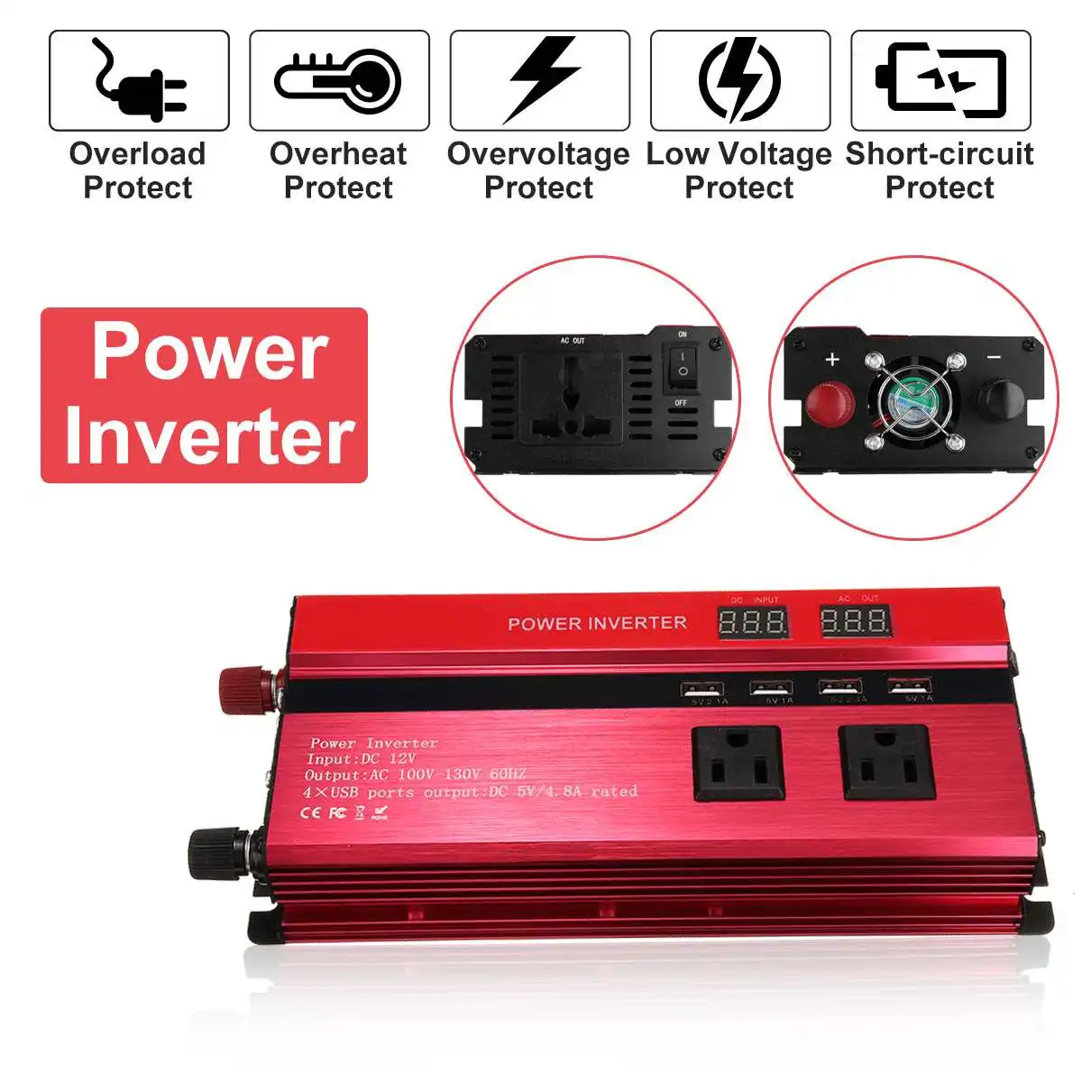 Посылка включает в себя:1*4000W DC12/24V к AC110V/220V солнечный инвертор1 * кабель с зажимом1 * Автомобильное зарядное устройствоСпецификация:Цвет: красный и розовыйРазмеры: 24,7*10,2*5,4 смМатериал: алюминиевый сплав P eak мощность: 4000 Вт [Максимальная мощность в лабораторной среде]