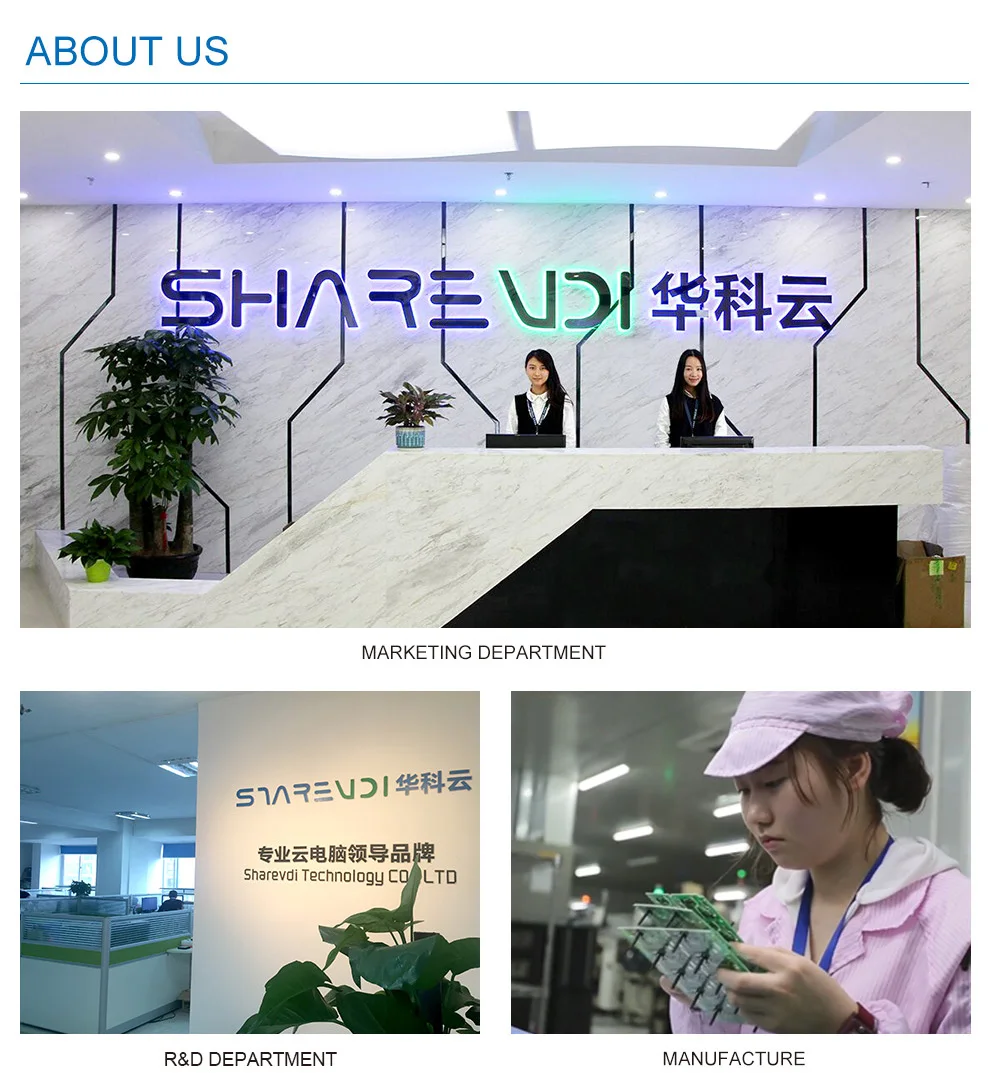 Sharevdi Technology Co., LtdЯвляется профессиональным zero клиентом, мини-ПК и все-в-одном поставщиком решений, который стремится к R & D, производству и маркетингу в этой области. R & D команда расположена в провинции Ухань Хубэй. И фабрика, и маркетинг находятся в Шэньчжэне. Мы занимаемся этой областью с 2006 года, что позволяет нам получить больше опыта, чем у других конкурентов. Мы стремимся помочь клиентам сэкономить средства и повысить безопасность данных путем применения различных решений. С нашей собственной R & D командой и фабрикой, которая делает нас может предложить обслуживание OEM для оборудования и программного обеспечения для удовлетворения различных требований клиентов.