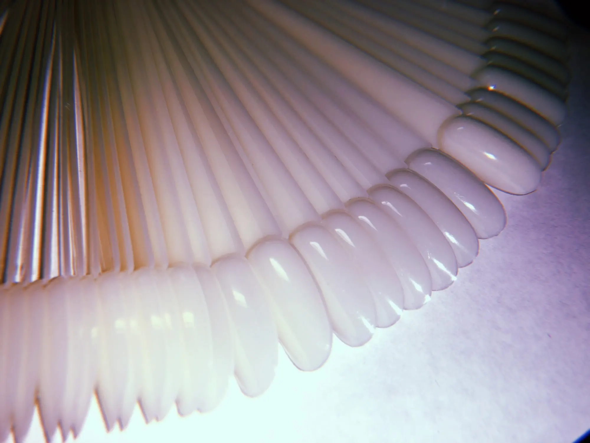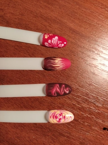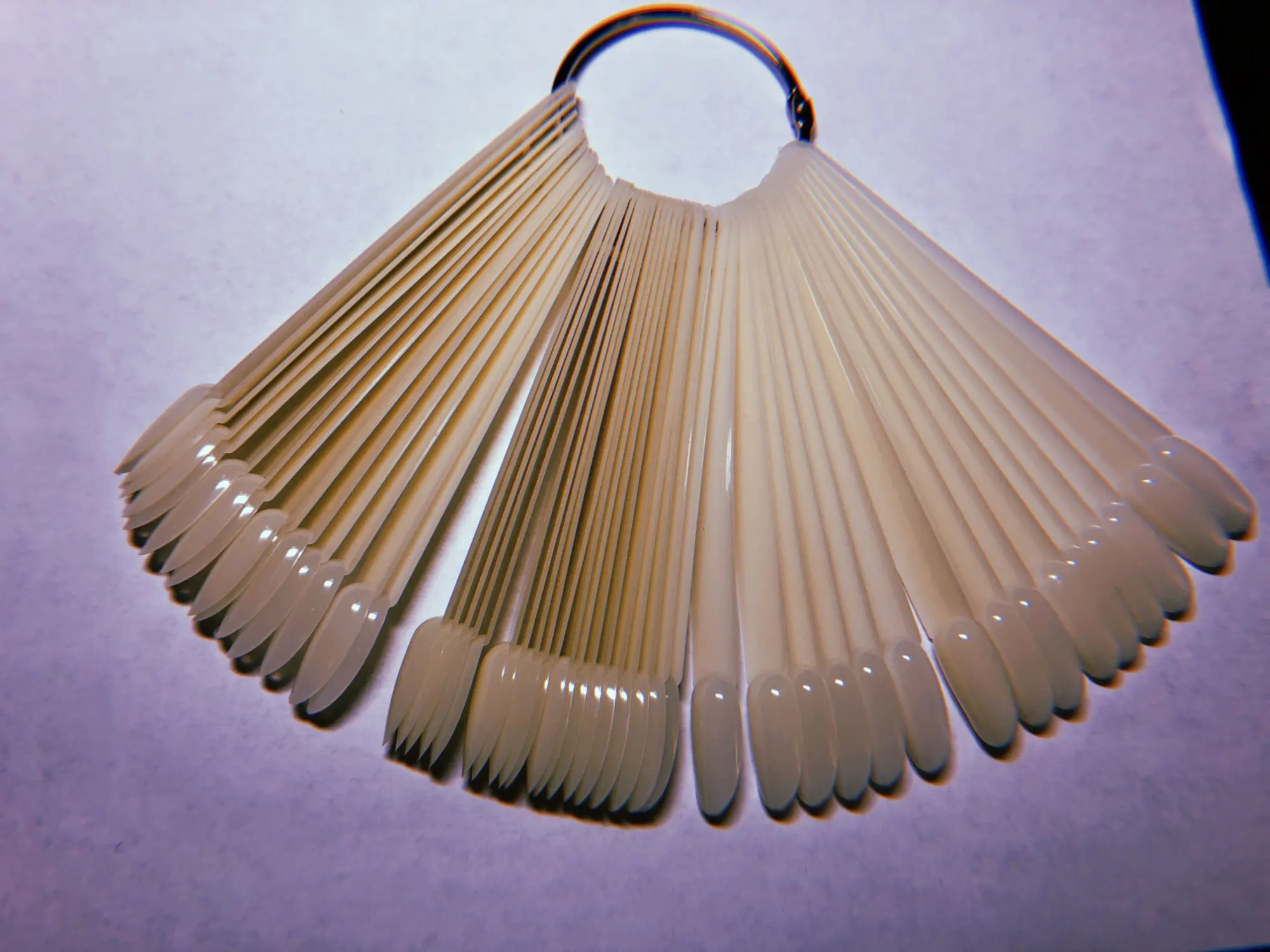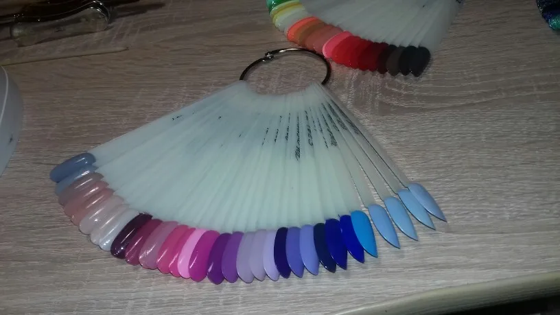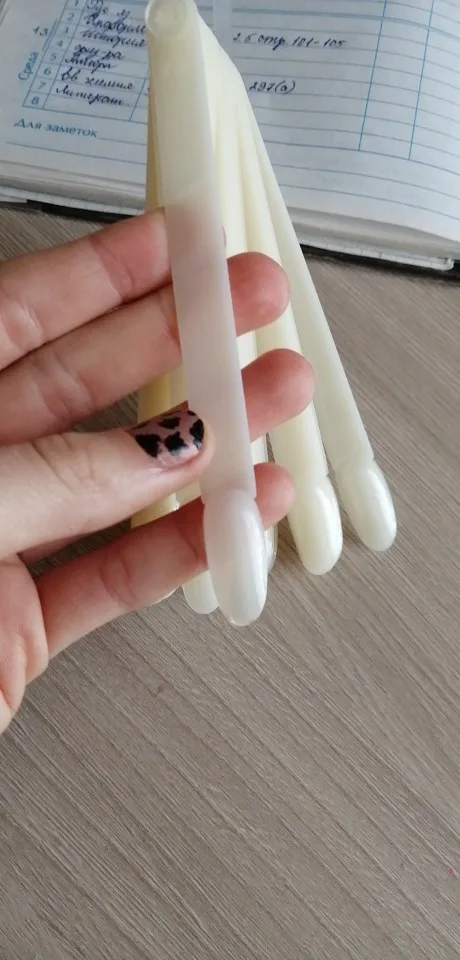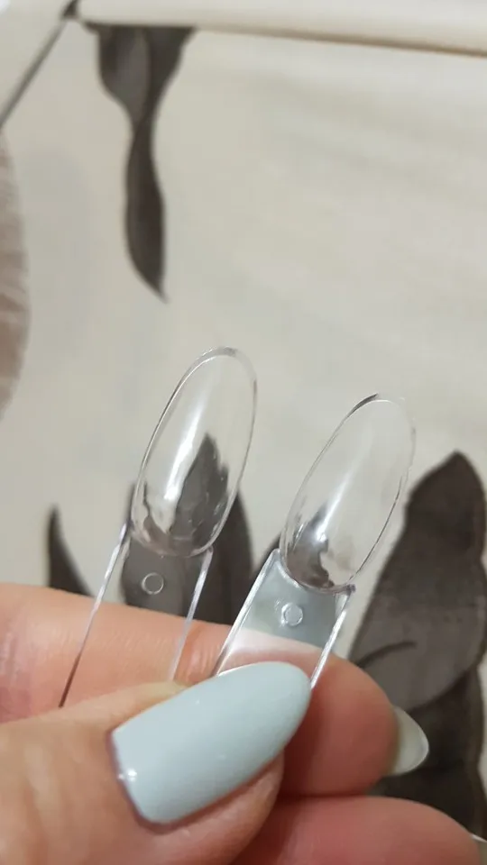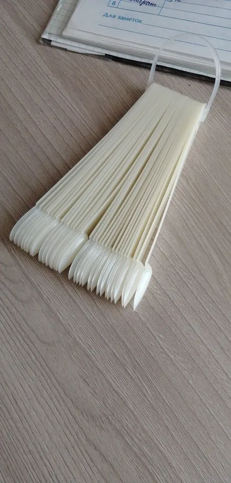 Типсы. Вполне обычные, край приличный, кое где есть неровности, подпилить не сложно, 2 взмаха и готово. От купленных в магазине отличает тонкость, и они в диаметре не много меньше, это не критично. Вот при выкраске почувствовала неудобство, для сравнения приложила 2 типсы. На данных имеется ступенька. Впринципе для выкраски не критично.