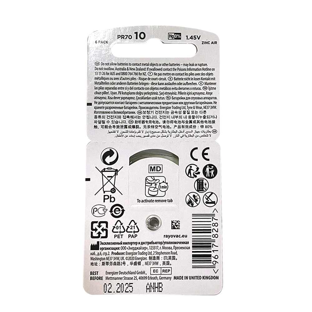 Модель: Размер 10A для CIC слуховых аппаратовУпаковка: 6 ячеекФормула без ртути с высоким напряжением для быстрого запускаУлучшенный дизайн клеток, который противостоит отекам и утечке, обеспечивая оптимальную производительность и большую консистенциюПерфорированная посылка позволяет снять циферблат для удобной транспортировкиЭкологически чистая посылка из переработанных или перерабатываемых материалов