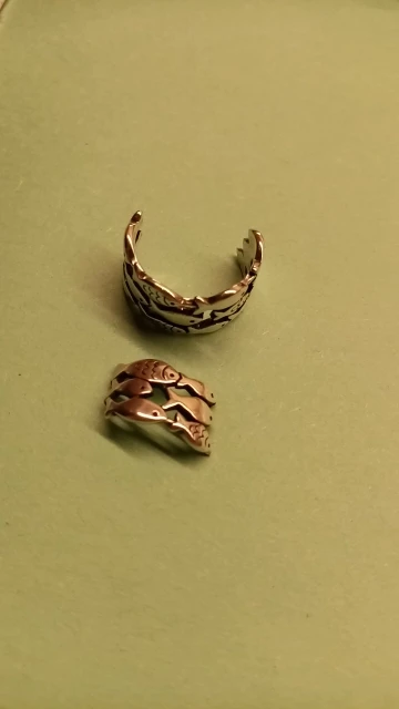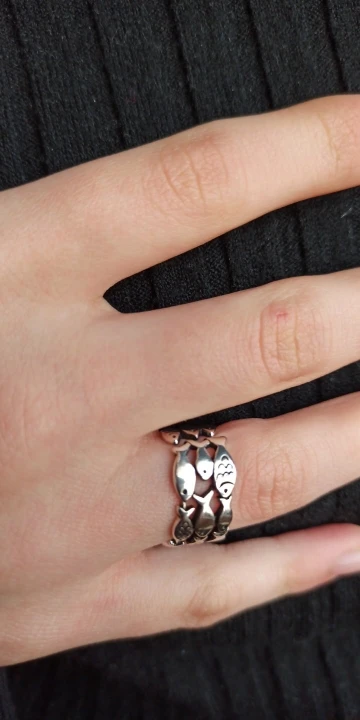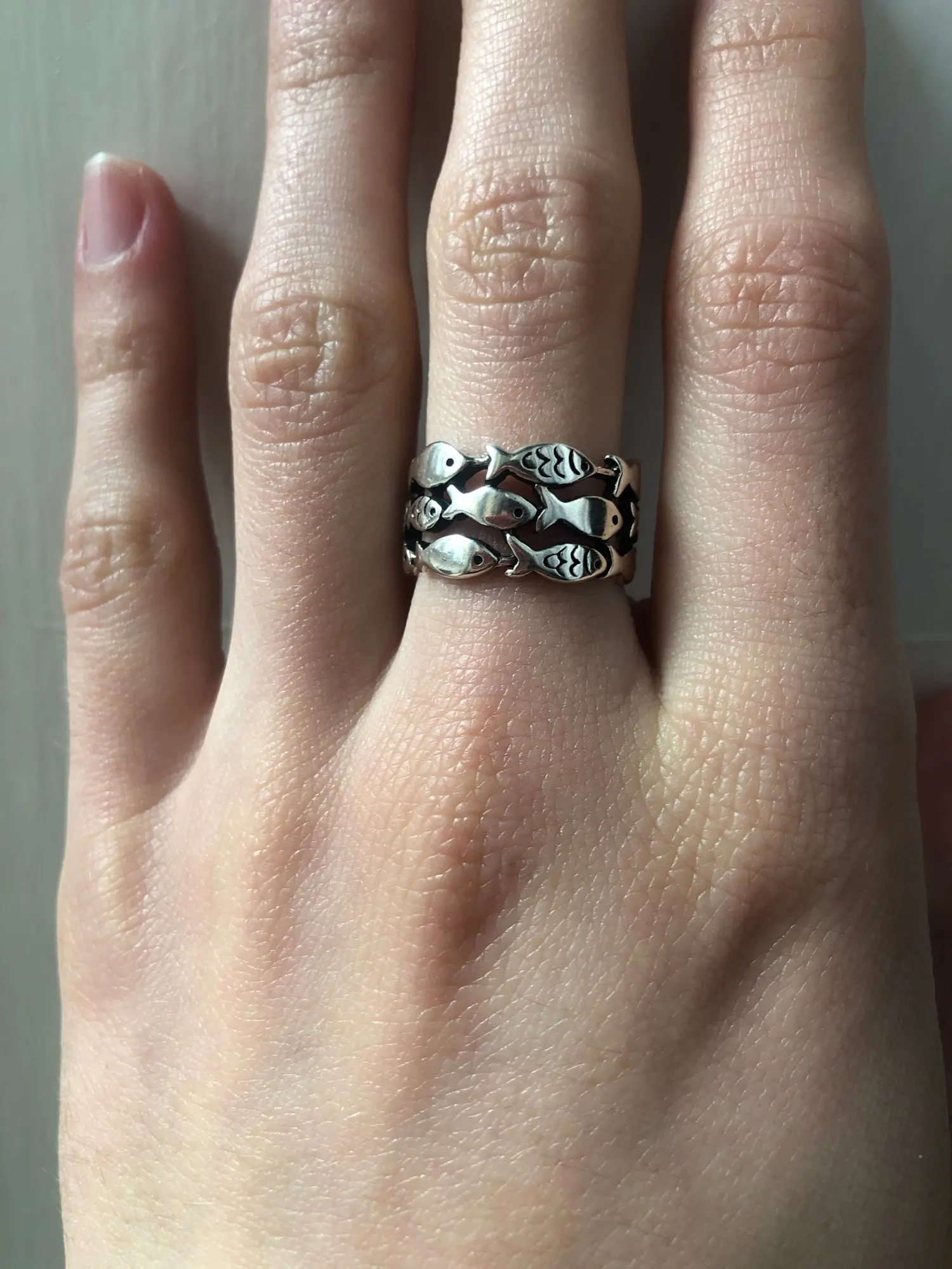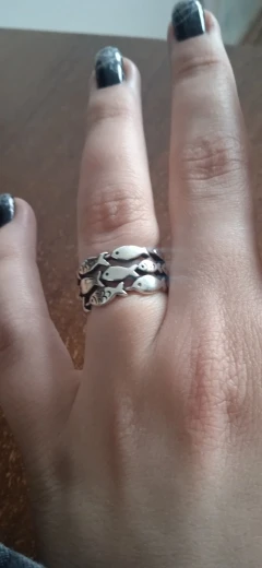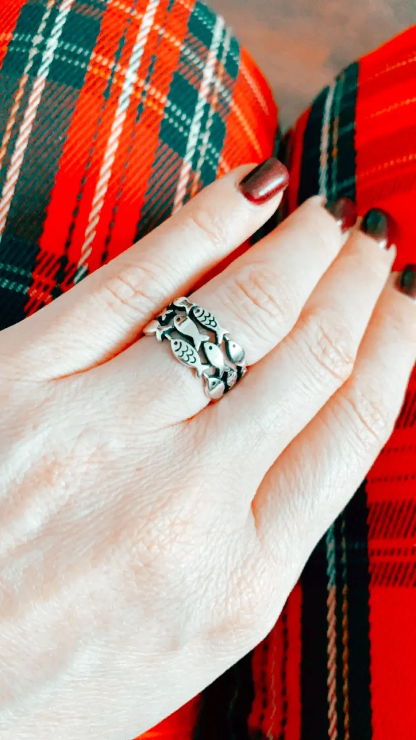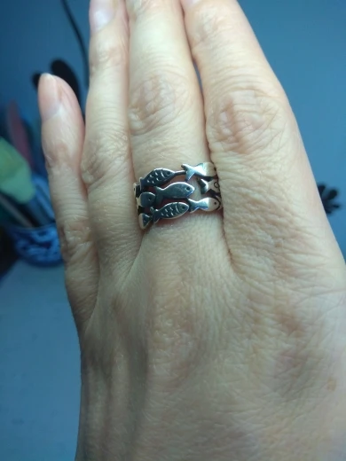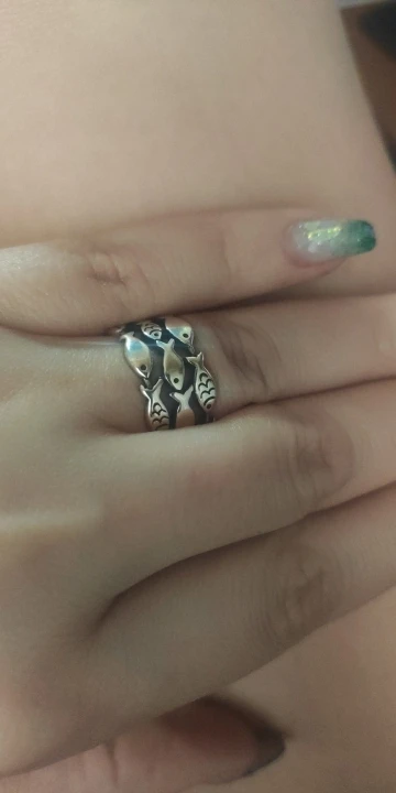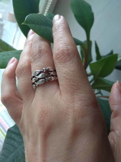 кольцо меняет размер, рыбки прочеканены отлично, выглядит опрятно. описанию соответствуют