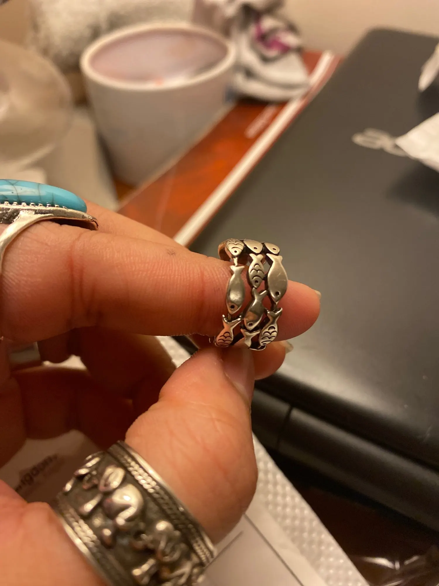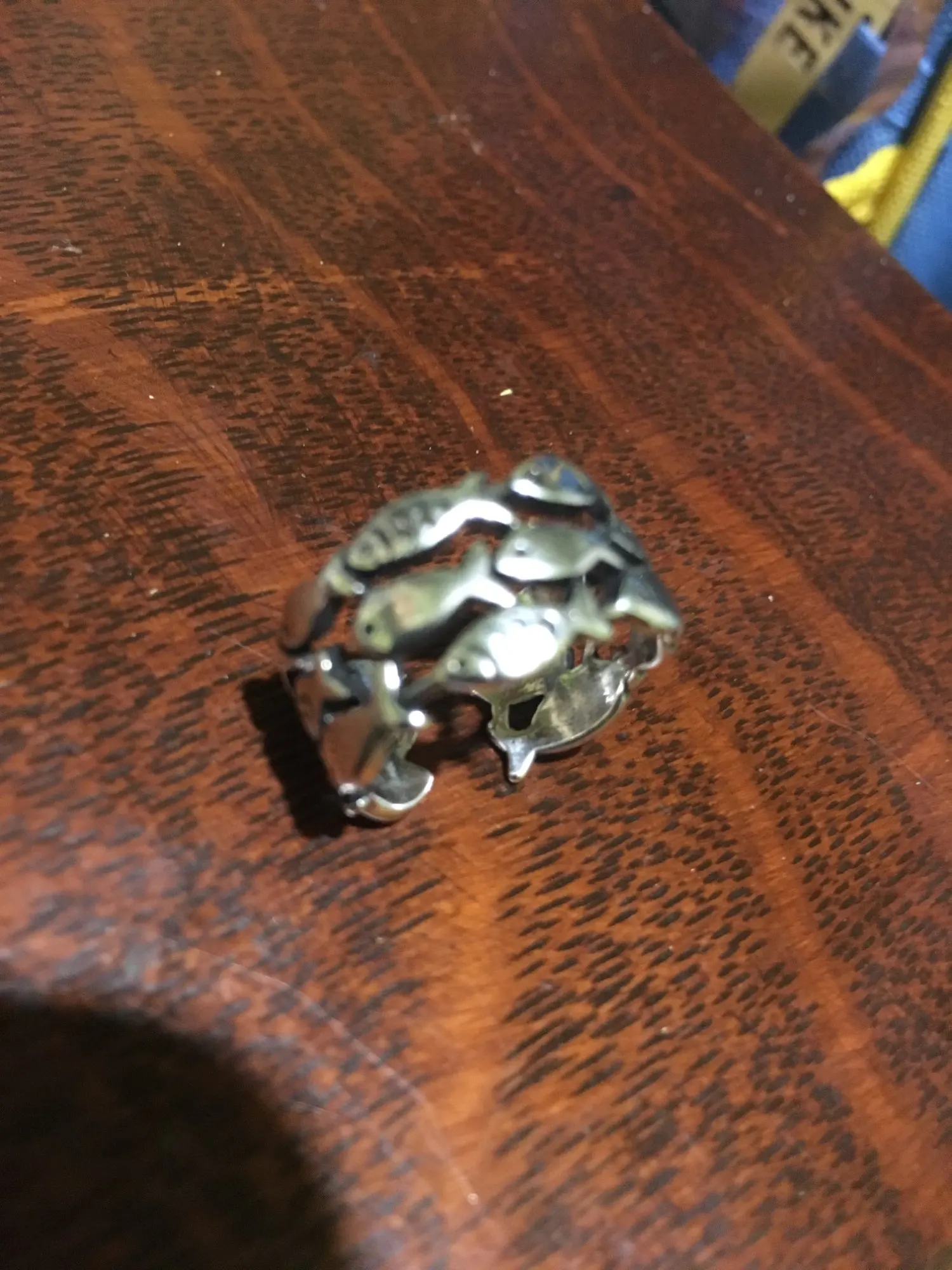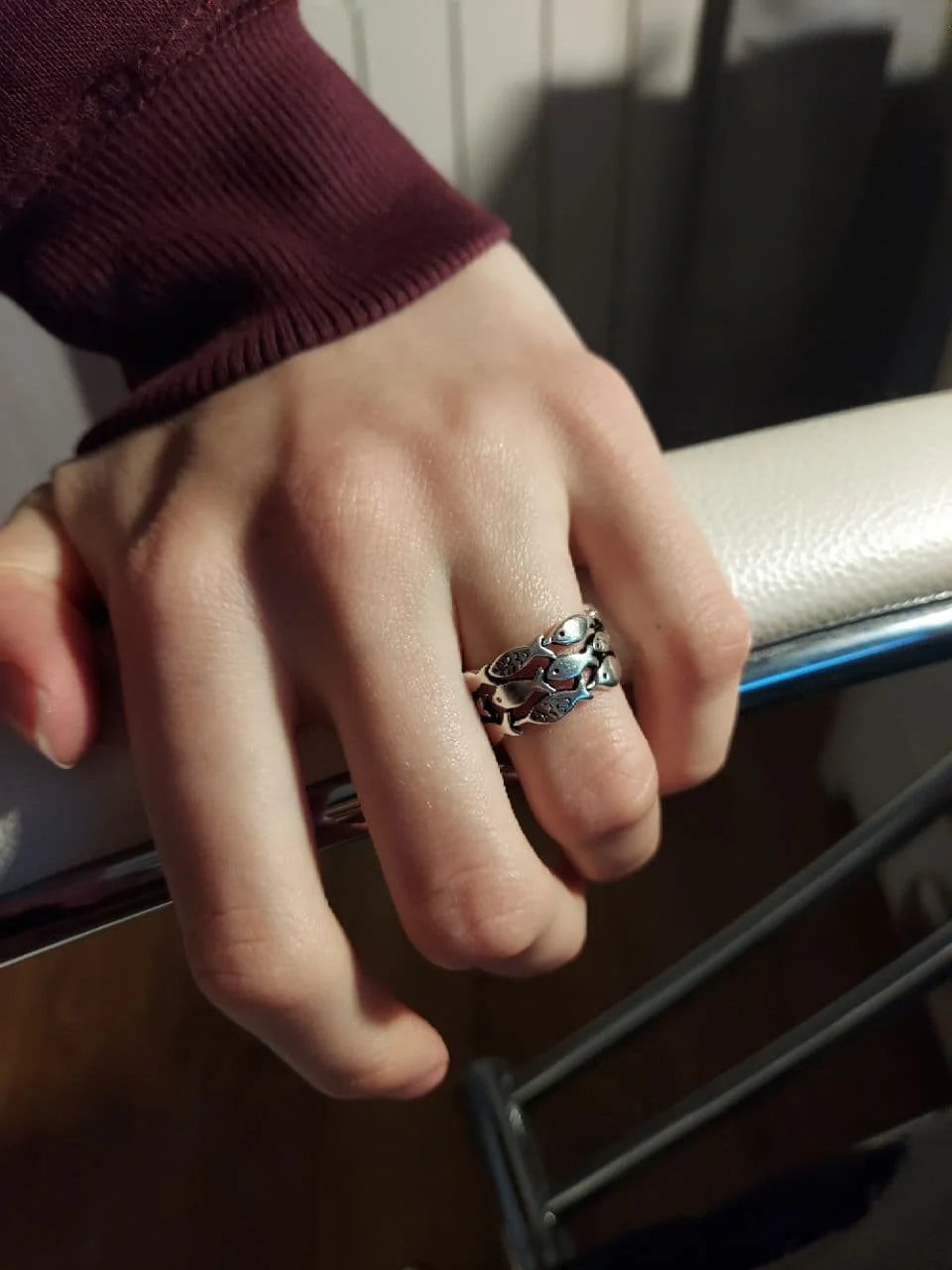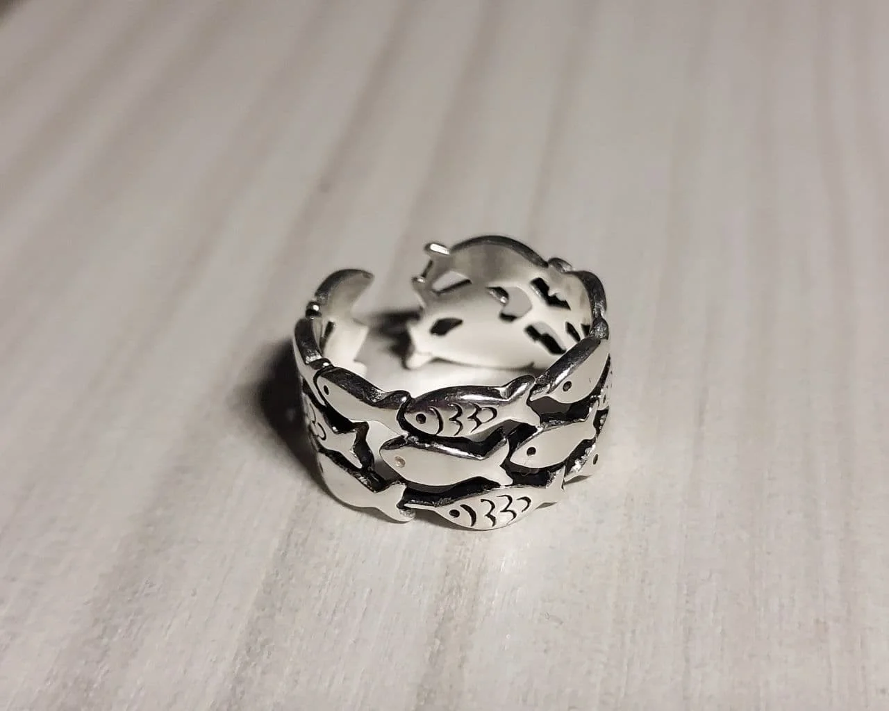 кольцо меняет размер, рыбки прочеканены отлично, выглядит опрятно. описанию соответствуют