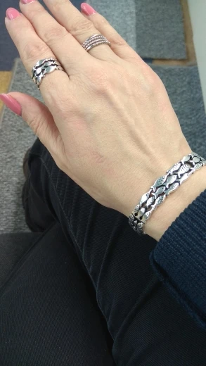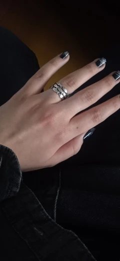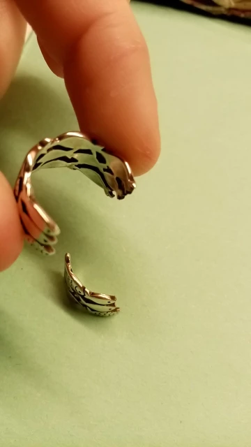 Красота, а не колечко!) Необычное, удобное, качественно сделанное. Очень похоже на серебро ( проба- то стоит..но цифры 925 угадываются только, если всю фантазию включить))) , но колечко годное! Докупила браслет в итоге и тонкий вариант этого кольца. В сомкнутом состоянии - 16 размер. Этот зазор абсолютно не мешает в носке. и не перекручивается . Вообще супер! Отлично подходит под мою тату в виде кота на руке)) Фото дополню, когда браслет приедет. Спасибо продавцу за красивенную вещицу!