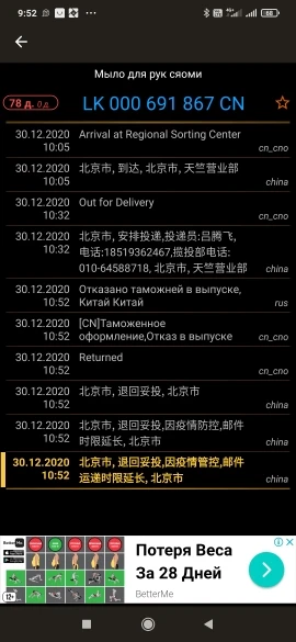Ждал заказ два с половиной месяца, но не дождался. На границе товар был возвращён обратно продавцу. После открытия спора деньги вернули. Очень жаль. Возможно из-за жидкого мыла, не захотели сливать на томожене.