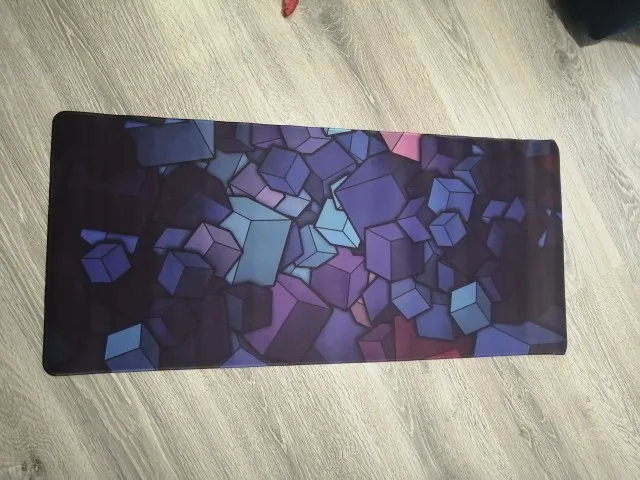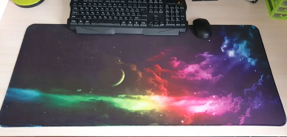 Доставка быстрая, коврэ хорош. Качество печати нормальное (рисунок с мелкими деталями брать не стоит, пожалуй, а так хорошо), не скользит, для игровых мышей с высоких dpi и под шутаны подходит. Размер как раз застелить стол во всей рабочей зоне.