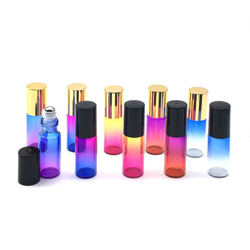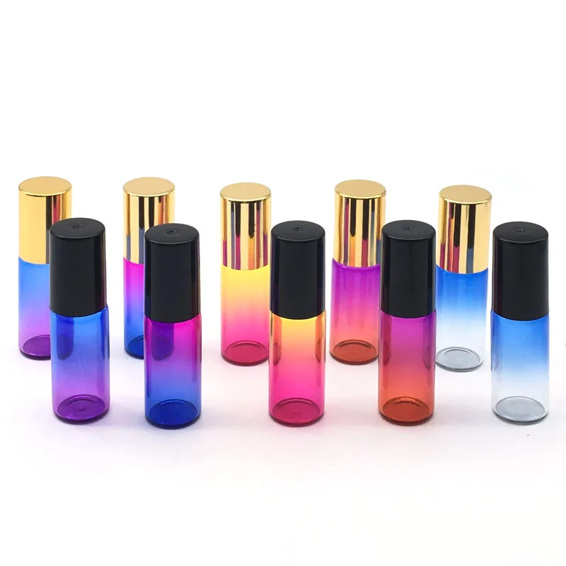 Градиентная цветная стеклянная бутылка 5 мл, рулон на пустой аромат, флакон эфирного масла для духов, 5 мл, рулон, черная/Золотая крышка, бутылка